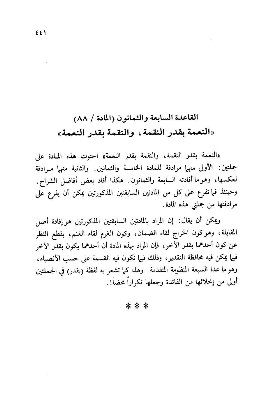 " النِّعْمَة بِقدر النقمَة، والنقمة بِقدر النِّعْمَة " احتوت هَذِه الْمَادَّة على جملتين: الأولى مِنْهُمَا مرادفة للمادة الْخَامِسَة والثمانين. وَالثَّانيَِة مِنْهُمَا مرادفة لعكسها، وَهُوَ مَا أفادته السَّابِعَة وَالثَّمَانُونَ. هَكَذَا أَفَادَ بعض أفاضل الشُّرَّاح. وَحِينَئِذٍ فَمَا تفرع على كل من الْمَادَّتَيْنِ السابقتين المذكورتين يُمكن أَن يفرع على مرادفتها من جملتي هَذِه الْمَادَّة.