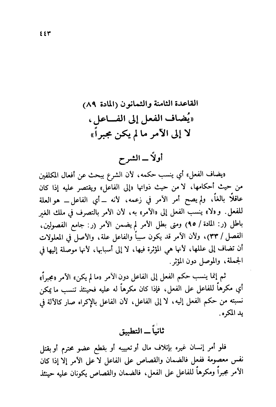 " يُضَاف الْفِعْل " أَي ينْسب حكمه، لِأَن الشَّرْع يبْحَث عَن أَفعَال الْمُكَلّفين من حَيْثُ أَحْكَامهَا، لَا من حَيْثُ ذواتها " إِلَى الْفَاعِل " ويقتصر عَلَيْهِ إِذا كَانَ عَاقِلا بَالغا، وَلم يَصح أَمر الْآمِر فِي زَعمه، لِأَنَّهُ _ أَي الْفَاعِل _ هُوَ الْعلَّة للْفِعْل. و " لَا " ينْسب الْفِعْل إِلَى " الْآمِر " بِهِ، لِأَن الْأَمر بِالتَّصَرُّفِ فِي ملك الْغَيْر بَاطِل (ر: الْمَادَّة / ٩٥) وَمَتى بَطل الْأَمر لم يضمن الْآمِر (ر: جَامع الْفُصُولَيْنِ، الْفَصْل / ٣٣) ، وَلِأَن الْآمِر قد يكون سَببا وَالْفَاعِل عِلّة، وَالْأَصْل فِي المعلولات أَن تُضَاف إِلَى عللها، لِأَنَّهَا هِيَ المؤثرة فِيهَا، لَا إِلَى أَسبَابهَا، لِأَنَّهَا موصلة إِلَيْهَا فِي الْجُمْلَة، والموصل دون الْمُؤثر.