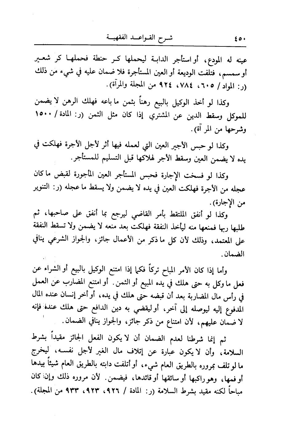 ثمَّ إِنَّمَا شرطنا لعدم الضَّمَان أَن لَا يكون الْفِعْل الْجَائِز مُقَيّدا بِشَرْط السَّلامَة، وَأَن لَا يكون عبارَة عَن إِتْلَاف مَال الْغَيْر لأجل نَفسه، ليخرج مَا لَو تلف بمروره بِالطَّرِيقِ الْعَام شَيْء، أَو أتلفت دَابَّته بِالطَّرِيقِ الْعَام شَيْئا بِيَدِهَا أَو فمها، وَهُوَ راكبها أَو سائقها أَو قائدها، فَيضمن. لِأَن مروره ذَلِك وَإِن كَانَ مُبَاحا لكنه مُقَيّد بِشَرْط السَّلامَة (ر: الْمَادَّة / ٩٢٦، ٩٢٣، ٩٣٣ من الْمجلة) .