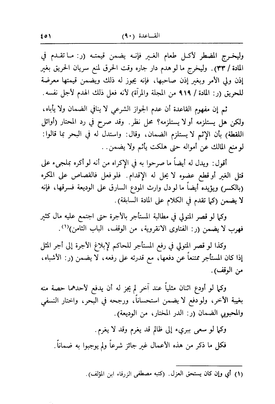 ثمَّ إِن مَفْهُوم الْقَاعِدَة أَن عدم الْجَوَاز الشَّرْعِيّ لَا يُنَافِي الضَّمَان وَلَا يأباه، وَلَكِن هَل يستلزمه أَو لَا يستلزمه؟ مَحل نظر. وَقد صرح فِي رد الْمُحْتَار (أَوَائِل اللّقطَة) بِأَن الْإِثْم لَا يسْتَلْزم الضَّمَان، وَقَالَ: وَاسْتدلَّ لَهُ فِي الْبَحْر بِمَا قَالُوا: لَو منع الْمَالِك عَن أَمْوَاله حَتَّى هَلَكت يَأْثَم وَلَا يضمن.