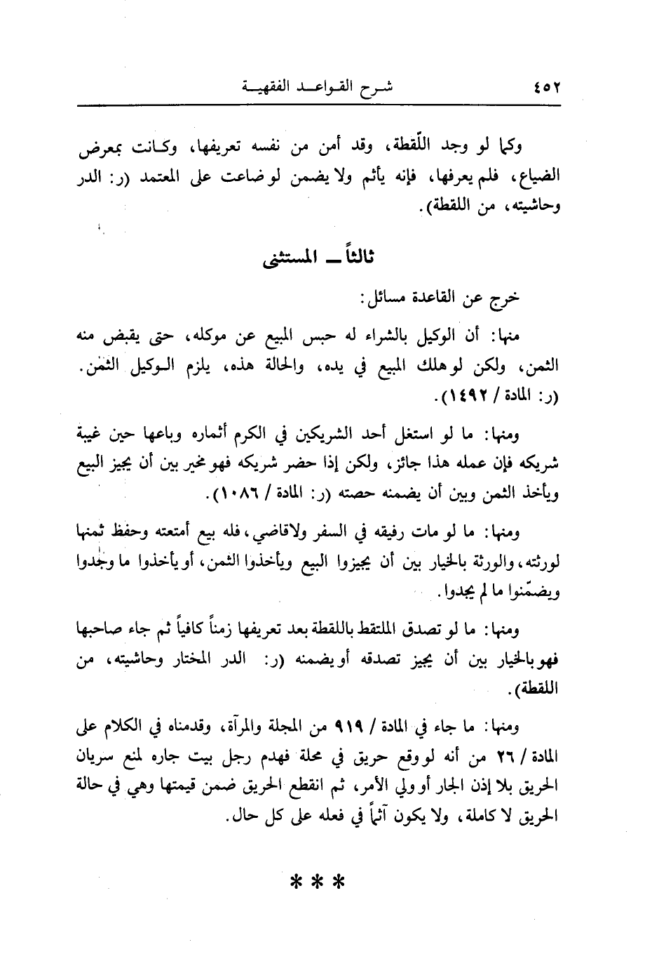 خرج عَن الْقَاعِدَة مسَائِل: مِنْهَا: أَن الْوَكِيل بِالشِّرَاءِ لَهُ حبس الْمَبِيع عَن مُوكله، حَتَّى يقبض مِنْهُ الثّمن، وَلَكِن لَو هلك الْمَبِيع فِي يَده، وَالْحَالة هَذِه، يلْزم الْوَكِيل الثّمن. (ر: الْمَادَّة / ١٤٩٢) .