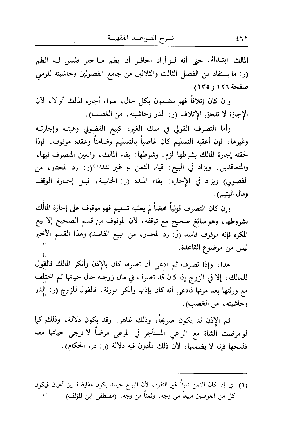 وَإِن كَانَ التَّصَرُّف قولياً مَحْضا لم يعقبه تَسْلِيم فَهُوَ مَوْقُوف على إجَازَة الْمَالِك بشروطها، وَهُوَ سَائِغ صَحِيح مَعَ توقفه، لِأَن الْمَوْقُوف فِي قسم الصَّحِيح إِلَّا بيع الْمُكْره فَإِنَّهُ مَوْقُوف فَاسد (ر: رد الْمُحْتَار، من البيع الْفَاسِد) وَهَذَا الْقسم الْأَخير لَيْسَ من مَوْضُوع الْقَاعِدَة.