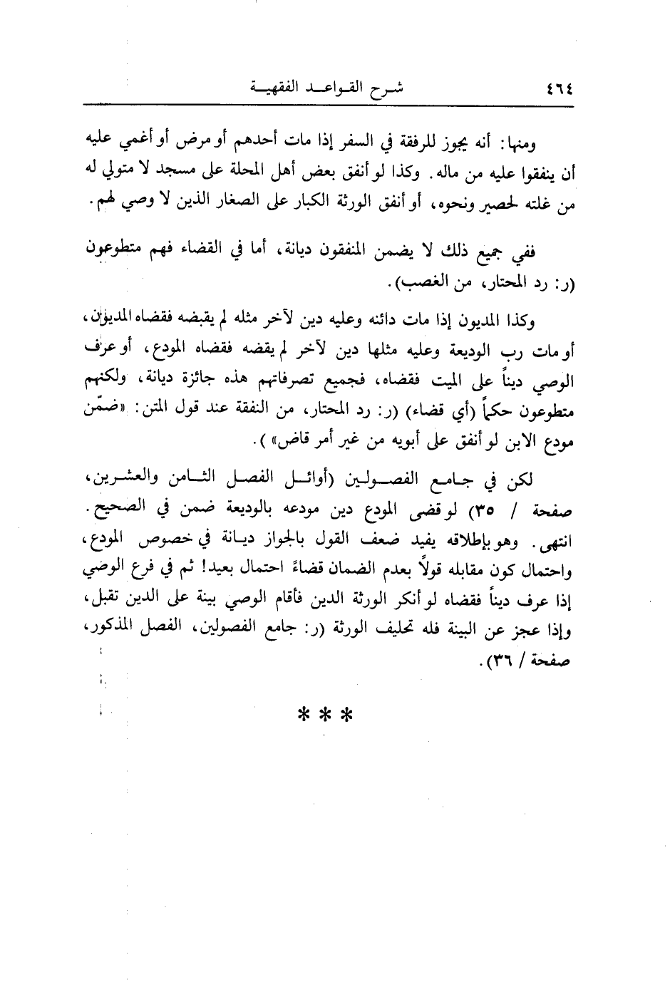 لَكِن فِي جَامع الْفُصُولَيْنِ (أَوَائِل الْفَصْل الثَّامِن وَالْعِشْرين، صفحة / ٣٥) لَو قضى الْمُودع دين مودعه بالوديعة ضمن فِي الصَّحِيح. انْتهى. وَهُوَ بِإِطْلَاقِهِ يُفِيد ضعف القَوْل بِالْجَوَازِ ديانَة فِي خُصُوص الْمُودع، وَاحْتِمَال كَون مُقَابِله قولا بِعَدَمِ الضَّمَان قَضَاء احْتِمَال بعيد! ثمَّ فِي فرع الْوَصِيّ إِذا عرف دينا فقضاه لَو أنكر الْوَرَثَة الدّين فَأَقَامَ الْوَصِيّ بَيِّنَة على الدّين تقبل، وَإِذا عجز عَن الْبَيِّنَة فَلهُ تَحْلِيف الْوَرَثَة (ر: جَامع الْفُصُولَيْنِ، الْفَصْل الْمَذْكُور، صفحة / ٣٦) .