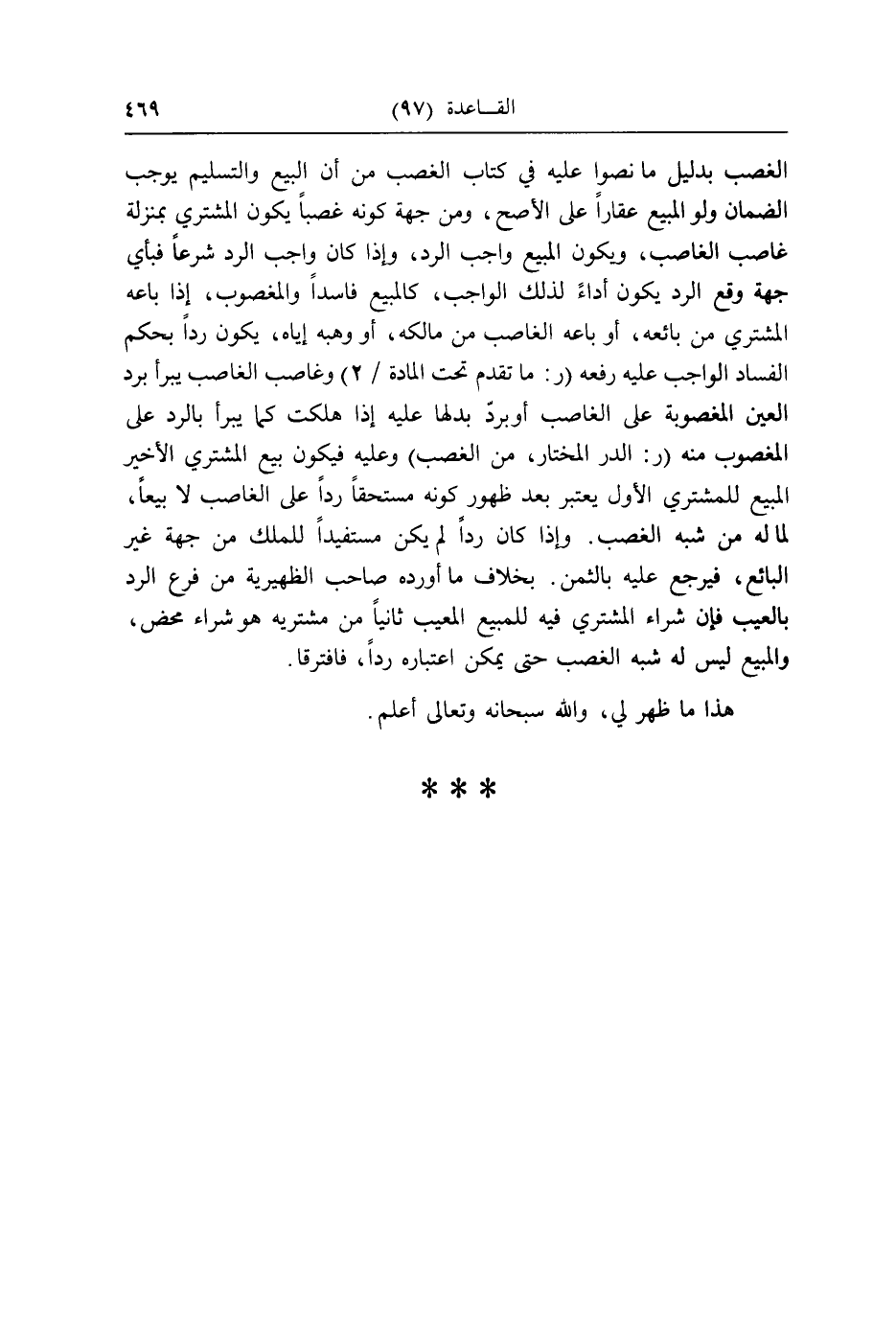 الْغَصْب بِدَلِيل مَا نصوا عَلَيْهِ فِي كتاب الْغَصْب من أَن البيع وَالتَّسْلِيم يُوجب الضَّمَان وَلَو الْمَبِيع عقارا على الْأَصَح، وَمن جِهَة كَونه غصبا يكون المُشْتَرِي بِمَنْزِلَة غَاصِب الْغَاصِب، وَيكون الْمَبِيع وَاجِب الرَّد، وَإِذا كَانَ وَاجِب الرَّد شرعا فَبِأَي جِهَة وَقع الرَّد يكون أَدَاء لذَلِك الْوَاجِب، كَالْمَبِيعِ فَاسِدا وَالْمَغْصُوب، إِذا بَاعه المُشْتَرِي من بَائِعه، أَو بَاعه الْغَاصِب من مَالِكه، أَو وهبه إِيَّاه، يكون ردا بِحكم الْفساد الْوَاجِب عَلَيْهِ رَفعه (ر: مَا تقدم تَحت الْمَادَّة / ٢) وغاصب الْغَاصِب يبرأ برد الْعين الْمَغْصُوبَة على الْغَاصِب أَو برد بدلهَا عَلَيْهِ إِذا هَلَكت كَمَا يبرأ بِالرَّدِّ على الْمَغْصُوب مِنْهُ (ر: الدّرّ الْمُخْتَار، من الْغَصْب) وَعَلِيهِ فَيكون بيع المُشْتَرِي الْأَخير الْمَبِيع للْمُشْتَرِي الأول يعْتَبر بعد ظُهُور كَونه مُسْتَحقّا ردا على الْغَاصِب لَا بيعا، لما لَهُ من شبه الْغَصْب. وَإِذا كَانَ ردا لم يكن مستفيداً للْملك من جِهَة غير البَائِع، فَيرجع عَلَيْهِ بِالثّمن. بِخِلَاف مَا أوردهُ صَاحب الظَّهِيرِيَّة من فرع الرَّد بِالْعَيْبِ فَإِن شِرَاء المُشْتَرِي فِيهِ للْمَبِيع الْمَعِيب ثَانِيًا من مُشْتَرِيه هُوَ شِرَاء مَحْض، وَالْمَبِيع لَيْسَ لَهُ شبه الْغَصْب حَتَّى يُمكن اعْتِبَاره ردا، فَافْتَرقَا.