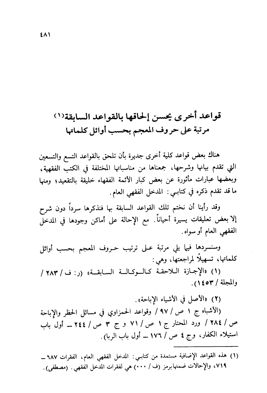 وَقد رَأينَا أَن نختم تِلْكَ الْقَوَاعِد السَّابِقَة بهَا فنذكرها سرداً دون شرح إِلَّا بعض تعليقات يسيرَة أَحْيَانًا. مَعَ الإحالة على أَمَاكِن وجودهَا فِي الْمدْخل الفقهي الْعَام أَو سواهُ.