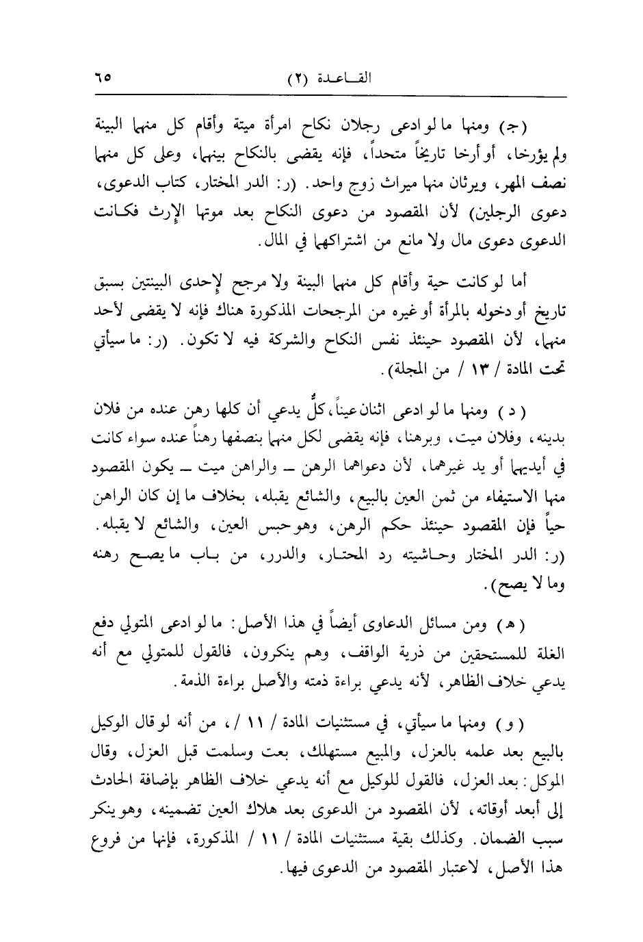 (و) وَمِنْهَا مَا سَيَأْتِي، فِي مستثنيات الْمَادَّة / ١١ /، من انه لَو قَالَ الْوَكِيل بِالْبيعِ بعد علمه بِالْعَزْلِ، وَالْمَبِيع مستهلك، بِعْت وسلمت قبل الْعَزْل، وَقَالَ الْمُوكل: بعد الْعَزْل، فَالْقَوْل للْوَكِيل مَعَ أَنه يَدعِي خلاف الظَّاهِر بِإِضَافَة الْحَادِث إِلَى أبعد أوقاته، لِأَن الْمَقْصُود من الدَّعْوَى بعد هَلَاك الْعين تَضْمِينه، وَهُوَ يُنكر سَبَب الضَّمَان. وَكَذَلِكَ بَقِيَّة مستثنيات الْمَادَّة / ١١ / الْمَذْكُورَة، فَإِنَّهَا من فروع هَذَا الأَصْل، لاعْتِبَار الْمَقْصُود من الدَّعْوَى فِيهَا.