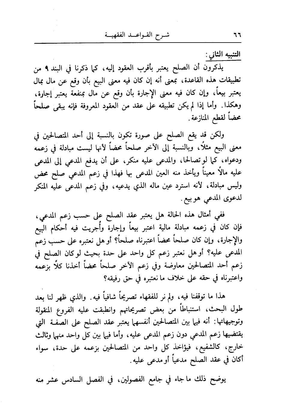 : يذكرُونَ أَن الصُّلْح يعْتَبر بأقرب الْعُقُود إِلَيْهِ، كَمَا ذكرنَا فِي البند ٩ من تطبيقات هَذِه الْقَاعِدَة، بِمَعْنى أَنه إِن كَانَ فِيهِ معنى البيع بِأَن وَقع عَن مَال بِمَال يعْتَبر بيعا، وَإِن كَانَ فِيهِ معنى الْإِجَارَة بِأَن وَقع عَن مَال بِمَنْفَعَة يعْتَبر إِجَارَة، وَهَكَذَا. وَأما إِذا لم يكن تطبيقه على عقد من الْعُقُود الْمَعْرُوفَة فَإِنَّهُ يبْقى صلحا مَحْضا لقطع الْمُنَازعَة.