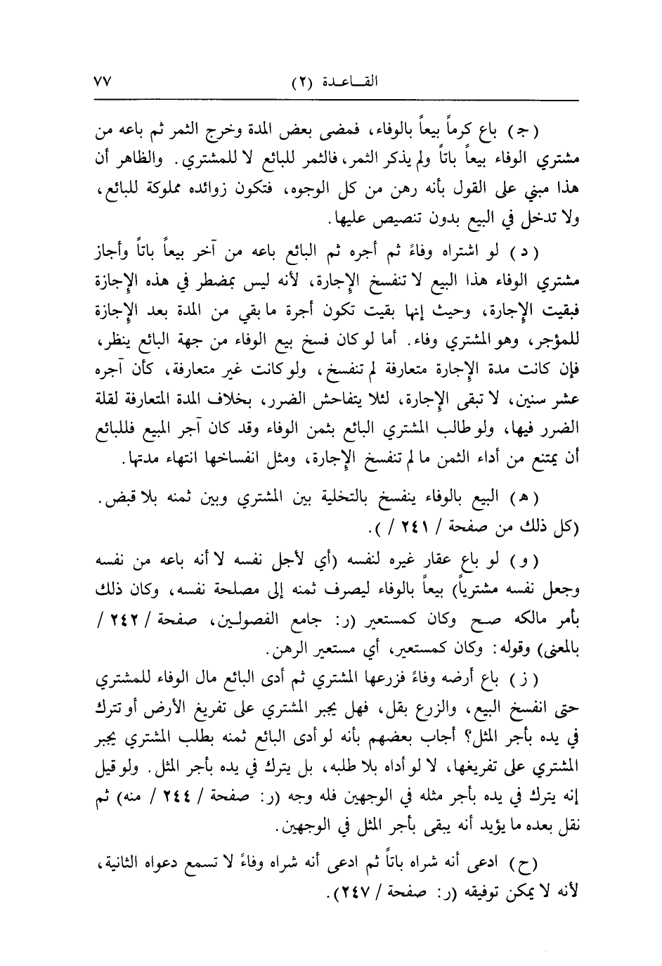 (هـ) البيع بِالْوَفَاءِ يَنْفَسِخ بِالتَّخْلِيَةِ بَين المُشْتَرِي وَبَين ثمنه بِلَا قبض. (كل ذَلِك من صفحة / ٢٤١ /) .