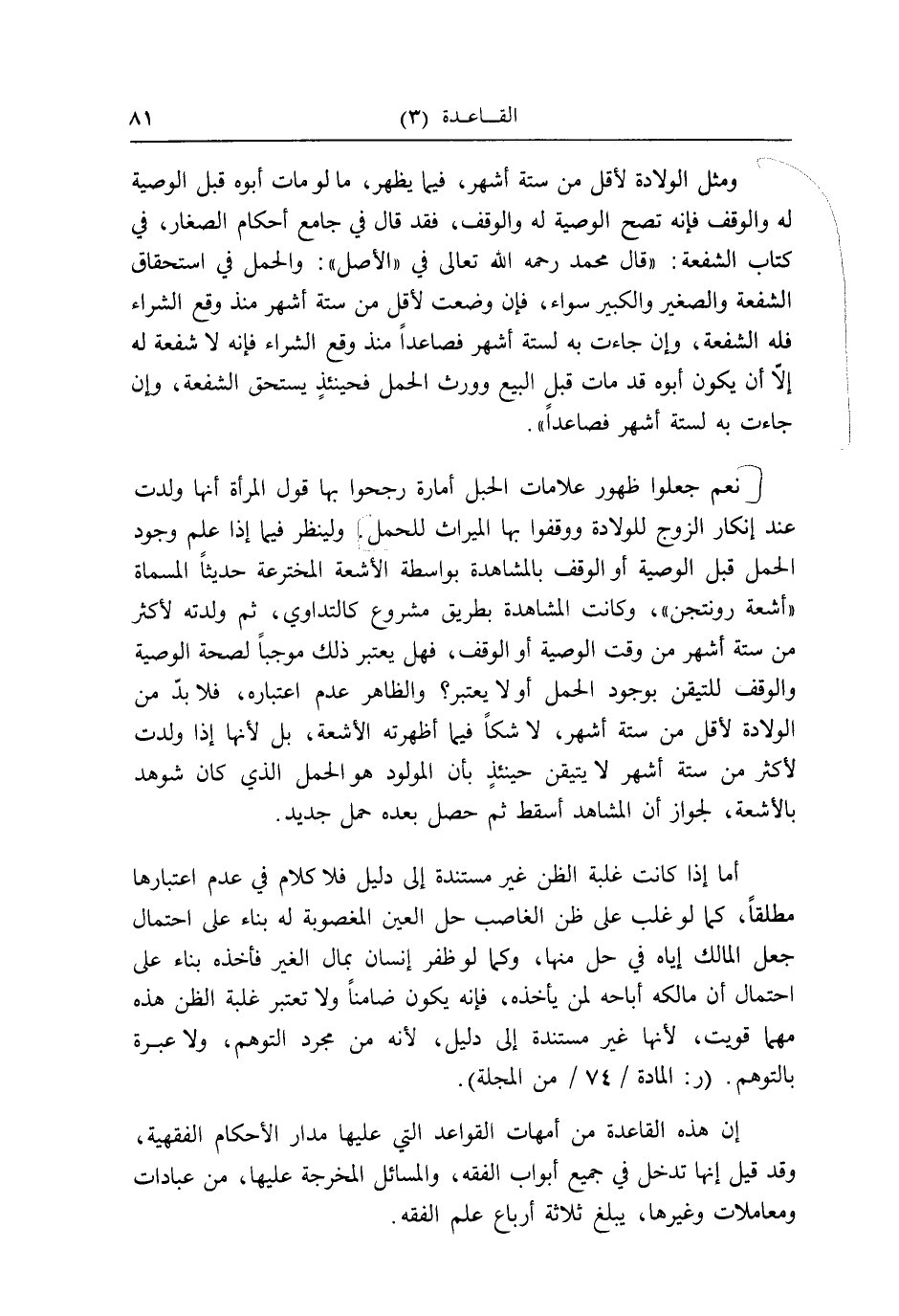 نعم جعلُوا ظُهُور عَلَامَات الْحَبل أَمارَة رجحوا بهَا قَول الْمَرْأَة أَنَّهَا ولدت عِنْد إِنْكَار الزَّوْج للولادة ووقفوا بهَا الْمِيرَاث للْحَمْل. ولينظر فِيمَا إِذا علم وجود الْحمل قبل الْوَصِيَّة أَو الْوَقْف بِالْمُشَاهَدَةِ بِوَاسِطَة الأشعة المخترعة حَدِيثا الْمُسَمَّاة " أشعة رونتجن "، وَكَانَت الْمُشَاهدَة بطرِيق مَشْرُوع كالتداوي، ثمَّ وَلدته لأكْثر من سِتَّة أشهر من وَقت الْوَصِيَّة أَو الْوَقْف، فَهَل يعْتَبر ذَلِك مُوجبا لصِحَّة الْوَصِيَّة وَالْوَقْف للتيقن بِوُجُود الْحمل أَو لَا يعْتَبر؟ وَالظَّاهِر عدم اعْتِبَاره، فَلَا بُد من الْولادَة لأَقل من سِتَّة أشهر، لَا شكا فِيمَا أظهرته الأشعة، بل لِأَنَّهَا إِذا ولدت لأكْثر من سِتَّة أشهر لَا يتَيَقَّن حينئذٍ بِأَن الْمَوْلُود هُوَ الْحمل الَّذِي كَانَ شوهد بالأشعة، لجَوَاز أَن الْمشَاهد أسقط ثمَّ حصل بعده حمل جَدِيد.
