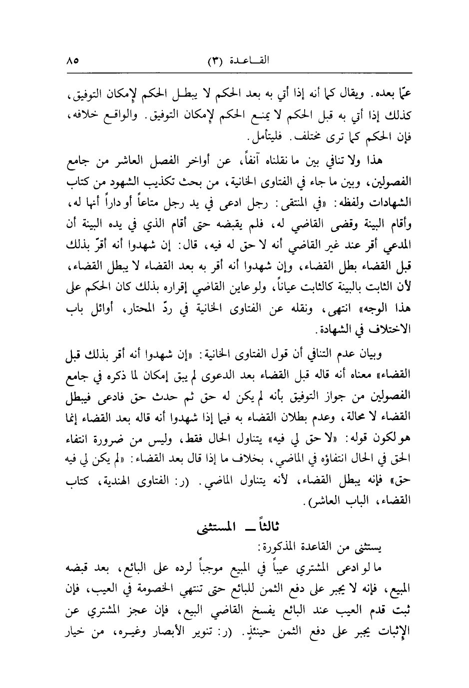 وَبَيَان عدم التَّنَافِي أَن قَول الْفَتَاوَى الْخَانِية: " إِن شهدُوا أَنه أقرّ بذلك قبل الْقَضَاء " مَعْنَاهُ أَنه قَالَه قبل الْقَضَاء بعد الدَّعْوَى لم يبْق إِمْكَان لما ذكره فِي جَامع الْفُصُولَيْنِ من جَوَاز التَّوْفِيق بِأَنَّهُ لم يكن لَهُ حق ثمَّ حدث حق فَادّعى فَيبْطل الْقَضَاء لَا محَالة، وَعدم بطلَان الْقَضَاء بِهِ فِيمَا إِذا شهدُوا أَنه قَالَه بعد الْقَضَاء إِنَّمَا هُوَ لكَون قَوْله: " لَا حق لي فِيهِ " يتَنَاوَل الْحَال فَقَط، وَلَيْسَ من ضَرُورَة انْتِفَاء الْحق فِي الْحَال انتفاؤه فِي الْمَاضِي، بِخِلَاف مَا إِذا قَالَ بعد الْقَضَاء: " لم يكن لي فِيهِ حق " فَإِنَّهُ يبطل الْقَضَاء، لِأَنَّهُ يتَنَاوَل الْمَاضِي. (ر: الْفَتَاوَى الْهِنْدِيَّة، كتاب الْقَضَاء، الْبَاب الْعَاشِر) .
