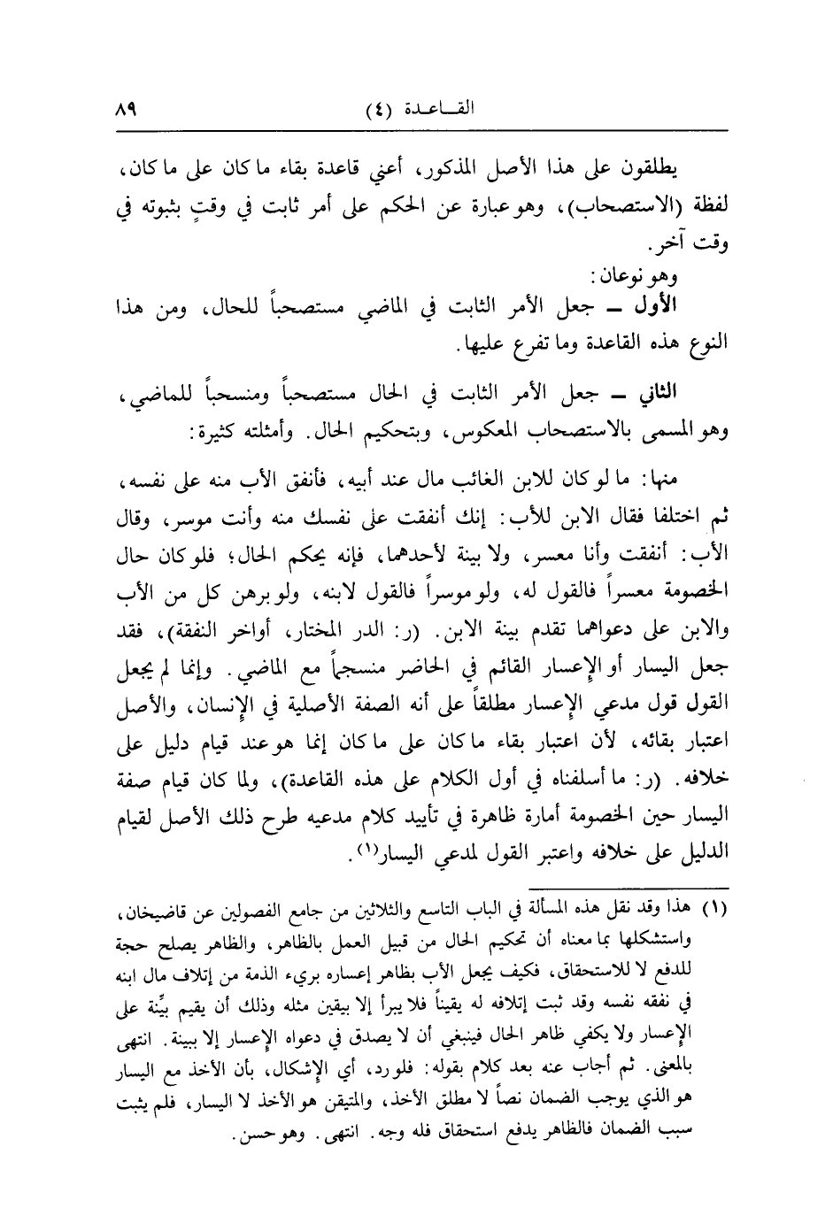 الثَّانِي _ جعل الْأَمر الثَّابِت فِي الْحَال مستصحباً ومنسحباً للماضي، وَهُوَ الْمُسَمّى بالاستصحاب المعكوس، وبتحكيم الْحَال، وأمثلته كَثِيرَة: مِنْهَا: مَا لَو كَانَ للِابْن الْغَائِب مَال عِنْد أَبِيه، فأنفق الْأَب مِنْهُ على نَفسه، ثمَّ اخْتلفَا فَقَالَ الابْن للْأَب: إِنَّك أنفقت على نَفسك مِنْهُ وَأَنت مُوسر، وَقَالَ الْأَب: أنفقت وَأَنا مُعسر، وَلَا بَيِّنَة لأَحَدهمَا، فَإِنَّهُ يحكم الْحَال؛ فَلَو كَانَ حَال الْخُصُومَة مُعسرا فَالْقَوْل لَهُ، وَلَو مُوسِرًا فَالْقَوْل لِابْنِهِ، وَلَو برهن كل من الْأَب وَالِابْن على دعواهما تقدم بَيِّنَة الابْن. (ر: الدّرّ الْمُخْتَار، أَوَاخِر النَّفَقَة) ، فقد جعل الْيَسَار أَو الْإِعْسَار الْقَائِم فِي الْحَاضِر منسجماً مَعَ الْمَاضِي. وَإِنَّمَا لم يَجْعَل القَوْل قَول مدعي الْإِعْسَار مُطلقًا على أَنه الصّفة الْأَصْلِيَّة فِي الْإِنْسَان، وَالْأَصْل اعْتِبَار بَقَائِهِ، لِأَن اعْتِبَار بَقَاء مَا كَانَ على مَا كَانَ إِنَّمَا هُوَ عِنْد قيام دَلِيل على خِلَافه. (ر: مَا أسلفناه فِي أول الْكَلَام على هَذِه الْقَاعِدَة) ، وَلما كَانَ قيام صفة الْيَسَار حِين الْخُصُومَة أَمارَة ظَاهِرَة فِي تأييد كَلَام مدعيه طرح ذَلِك الأَصْل لقِيَام الدَّلِيل على خِلَافه وَاعْتبر القَوْل لمُدعِي الْيَسَار.