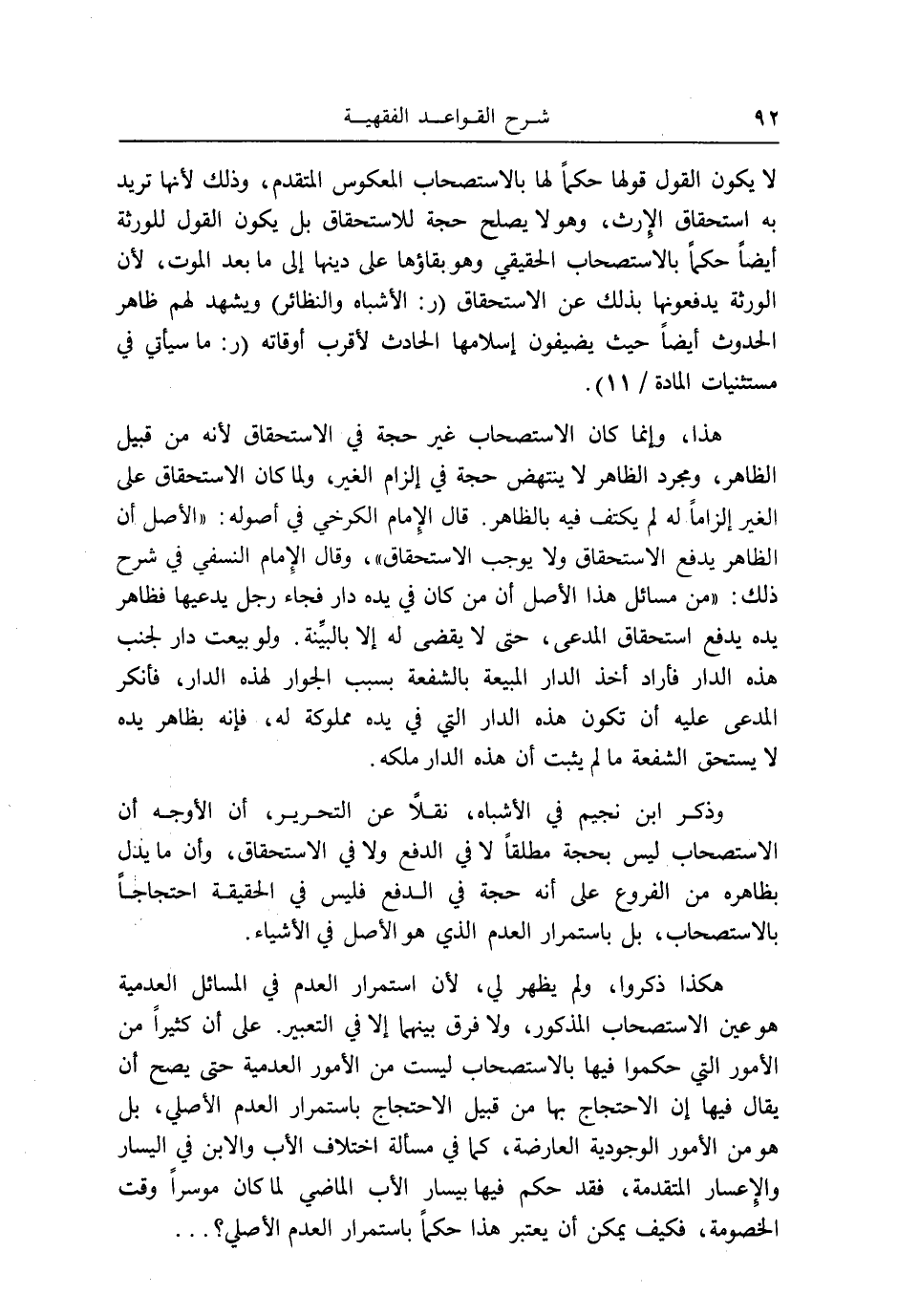 هَكَذَا ذكرُوا، وَلم يظْهر لي، لِأَن اسْتِمْرَار الْعَدَم فِي الْمسَائِل العدمية هُوَ عين الِاسْتِصْحَاب الْمَذْكُور، وَلَا فرق بَينهمَا إِلَّا فِي التَّعْبِير. على أَن كثيرا من الْأُمُور الَّتِي حكمُوا فِيهَا بالاستصحاب لَيست من الْأُمُور العدمية حَتَّى يَصح أَن يُقَال فِيهَا إِن الِاحْتِجَاج بهَا من قبيل الِاحْتِجَاج باستمرار الْعَدَم الْأَصْلِيّ، بل هُوَ من الْأُمُور الوجودية الْعَارِضَة، كَمَا فِي مَسْأَلَة اخْتِلَاف الْأَب وَالِابْن فِي الْيَسَار والإعسار الْمُتَقَدّمَة، فقد حكم فِيهَا بيسار الْأَب الْمَاضِي لما كَانَ مُوسِرًا وَقت الْخُصُومَة، فَكيف يُمكن أَن يعْتَبر هَذَا حكما باستمرار الْعَدَم الْأَصْلِيّ؟ ... .
