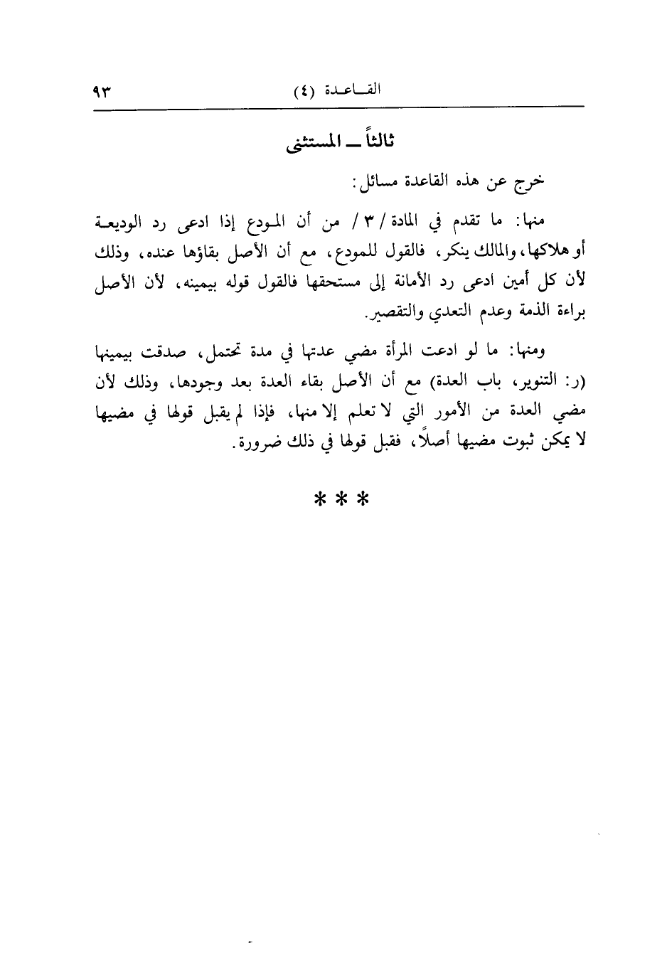 خرج عَن هَذِه الْقَاعِدَة مسَائِل: مِنْهَا: مَا تقدم فِي الْمَادَّة / ٣ / من أَن الْمُودع إِذا ادّعى رد الْوَدِيعَة أَو هلاكها، وَالْمَالِك يُنكر، فَالْقَوْل للْمُودع، مَعَ أَن الأَصْل بَقَاؤُهَا عِنْده، وَذَلِكَ لِأَن كل أَمِين ادّعى رد الْأَمَانَة إِلَى مستحقها فَالْقَوْل قَوْله بِيَمِينِهِ، لِأَن الأَصْل بَرَاءَة الذِّمَّة وَعدم التَّعَدِّي وَالتَّقْصِير.