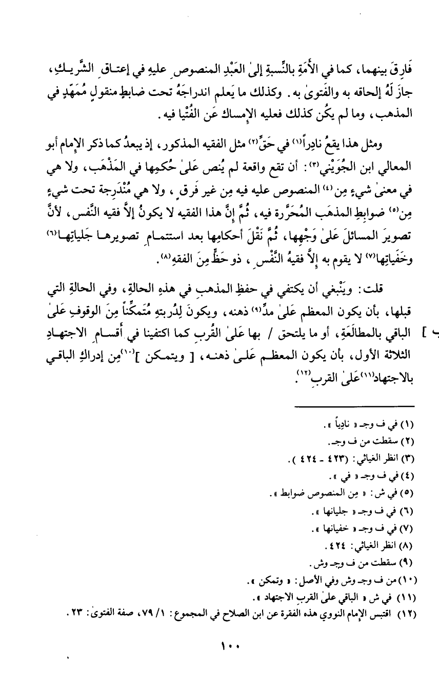 ومثل هذا يقع نادرًا١ في حق٢ مثل الفقيه المذكور، إذ يبعد كما ذكر الإمام أبو المعالي ابن الجويني٣: أن تقع واقعة لم ينص على حكمها في المذهب، ولا هي في معنى شيء من٤ المنصوص عليه فيه من غير فرق، ولا هي مندرجة تحت شيء من٥ ضوابط المذهب المحررة فيه، ثم إن هذا الفقيه لا يكون إلا فقيه النفس، لأن تصوير المسائل على وجهها، ثم نقل أحكامها بعد استتمام تصويرها جلياتها٦ وخفياتها٧ لا يقوم إلا فقيه النفس، ذو حظ من الفقه٨.