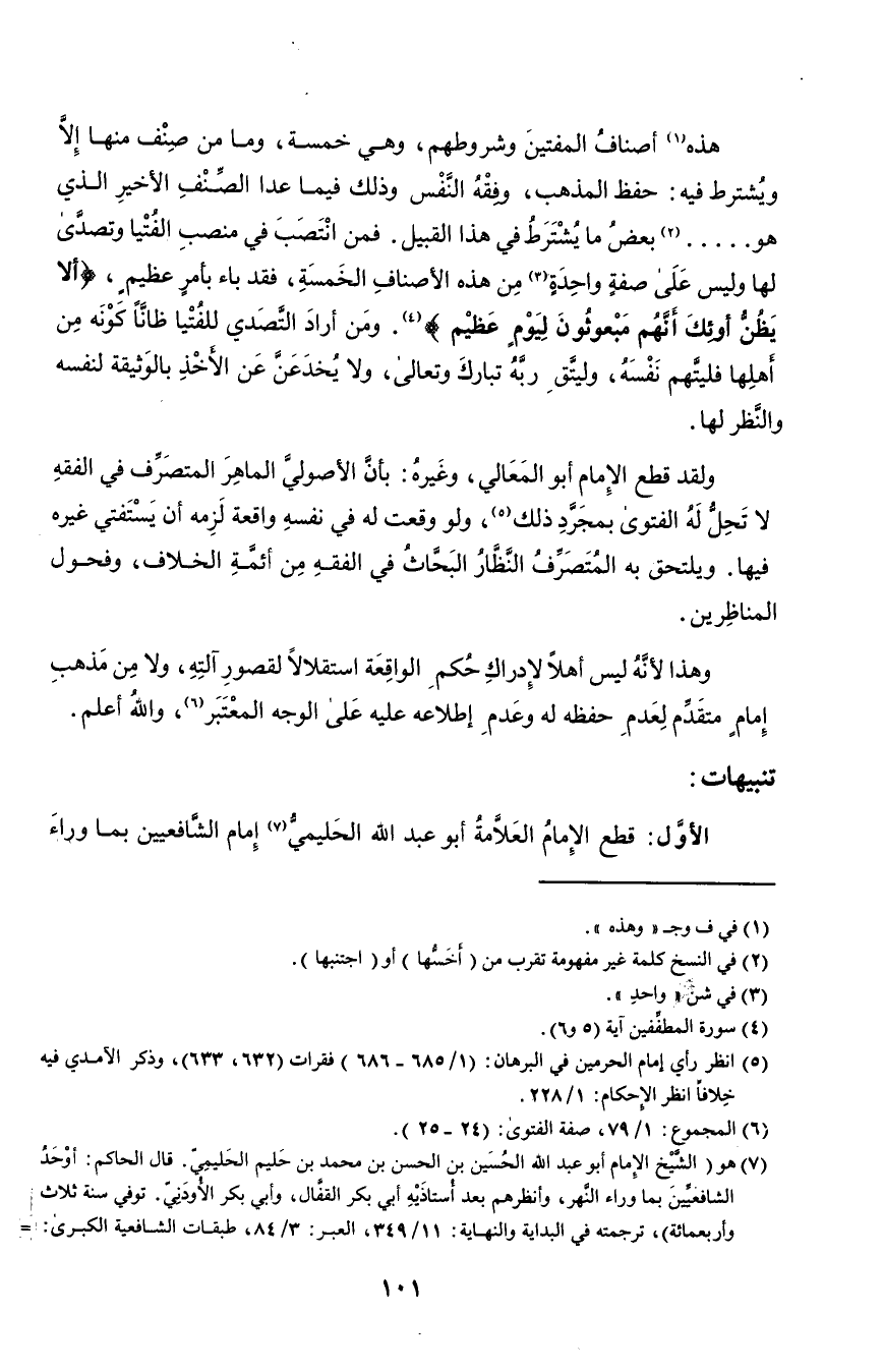 هذه١ أصناف المفتين وشروطهم، وهي خمسة، وما من صنف منها إلا ويشترط فيه: حفظ المذهب، وفقه النفس وذلك فيما عدا الصنف الأخير الذي هو٢ بعض ما يشترط في هذا القبيل. فمن انتصب في منصب الفتيا وتصدى لها وليس على صفة واحدة٢ من هذه الأصناف الخمسة، فقد باء بأمر عظيم، {أَلا يَظُنُّ أُولَئِكَ أَنَّهُمْ مَبْعُوثُون, لِيَوْمٍ عَظِيمٍ} ٤، ومن أراد التصدي للفتيا ظانًّا كونه من أهلها فليتهم نفسه، وليتق ربه تبارك وتعالى، ولا يخدعن عن الأخذ بالوثيقة لنفسه والنظر لها.