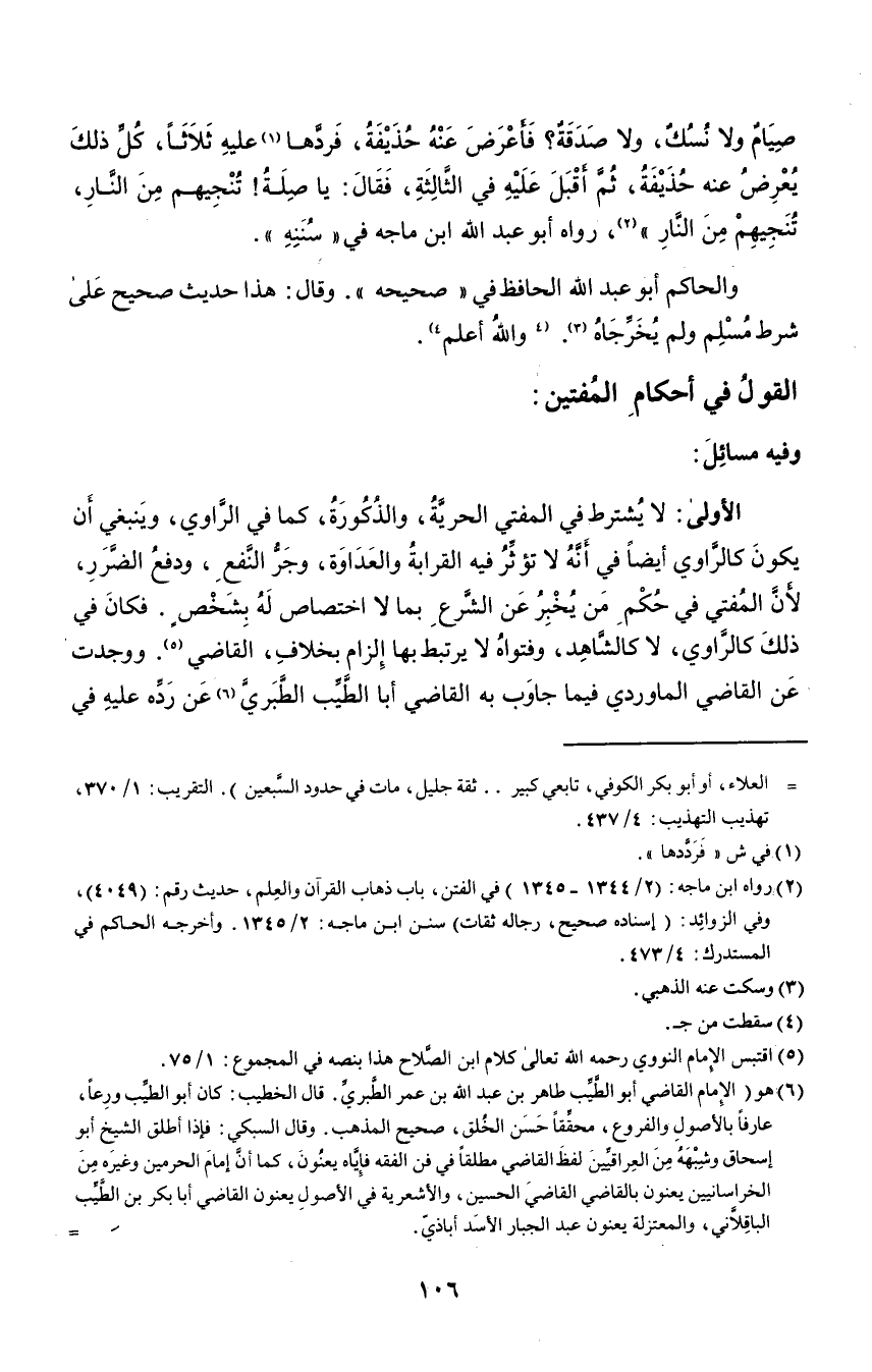 الأولى: لا يشترط في المفتي الحرية، والذكورة، كما في الراوي، وينبغي أن يكون كالراوي أيضًا في أنه لا تؤثر فيه القرابة والعداوة، وجر النفع، ودفع الضرر، لأن المفتي في حكم من يخبر عن الشرع بما لا اختصاص له بشخص. فكان في ذلك كالراوي، لا كالشاهد، وفتواه لا يرتبط بها إلزام بخلاف، القاضي١، ووجدت عن القاضي الماوردي فيما جاوب به القاضي أبا الطيب الطبري٢ عن رده عليه في