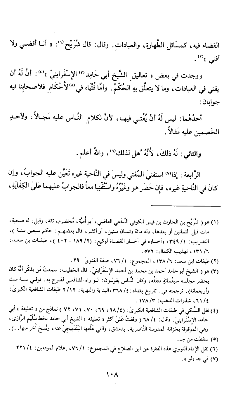 الرابعة: إذا٧ استفتي المفتي وليس في الناحية غيره تعين عليه الجواب، وإن كان في الناحية غيره، فإن حضر هو وغيره واستفتيا معًا فالجواب عليهما على الكفاية،