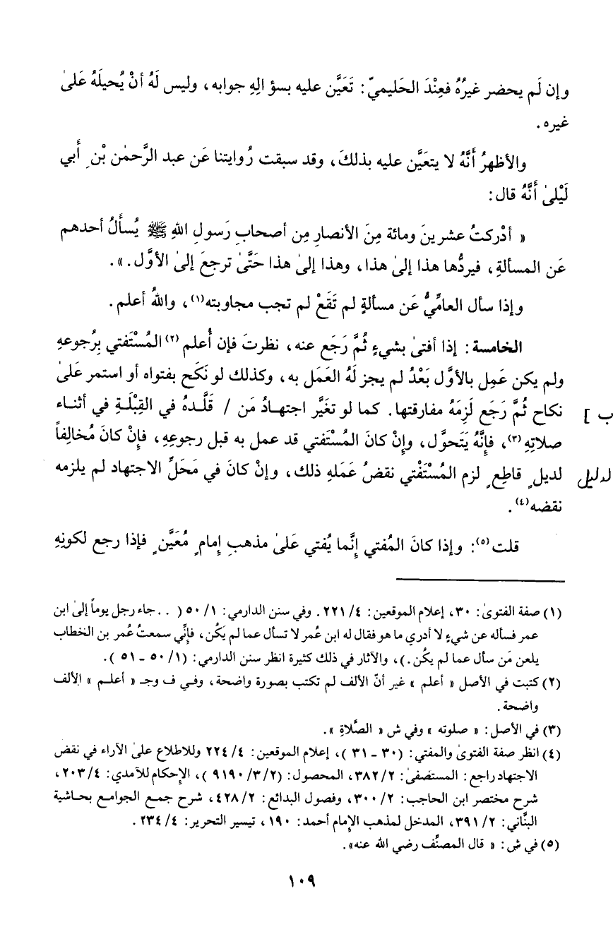 الخامسة: إذا أفتى بشيء ثم رجع عنه، نظرت فإن أعلم٢ المستفتي برجوعه ولم يكن عمل بالأول بعد لم يجز له العمل به، وكذلك لو نكح بفتواه أو استمر على نكاح, ثم رجع لزمه مفارقتها. كما لو تغير اجتهاد من قلده في القبلة في أثناء صلاته٣، فإنه يتحول، وإن كان المستفتي قد عمل به قبل رجوعه، فإن كان خالفًا لدليل قاطع لزم المستفتي نقض عمله ذلك، وإن كان في محل الاجتهاد لم يلزمه نقضه٤.