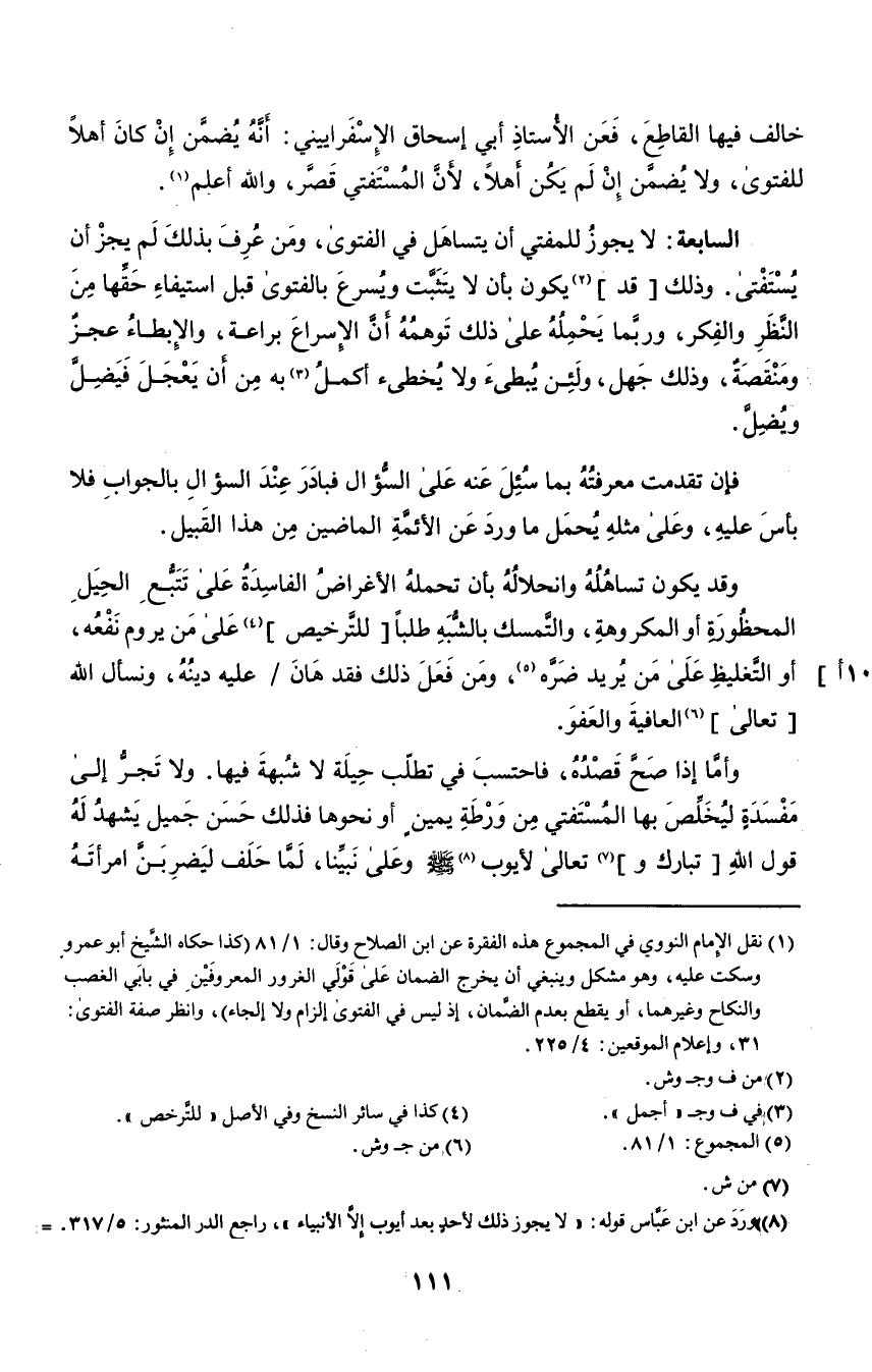 السابعة: لا يجوز للمفتي أن يتساهل في الفتوى، ومن عرف بذلك لم يجز أن يستفتي. وذلك "قد"٢ يكون بأن لا يثبت ويسرع بالفتوى قبل استيفاء حقها من النظر والفكر، وربما يحمله على ذلك توهمه أن الإسراع براعة، والإبطاء عجز ومنقصة، وذلك جهل، ولئن يبطئ ولا يخطئ أكمل٣ به من أن يعجل فيضل ويضل.