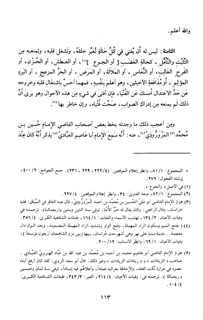 الثامنة: ليس له أن يفتي في كل حالة تغير خلقه، وتشغل قلبه، وتمنعه من التثبت والتأمل، كحالة الغضب "أو الجوع"١، أو العطش، أو الحزن، أو الفرح الغالب، أو النعاس، أو الملالة، أو المرض، أو الحر المزعج، أو البرد المؤلم، أو مدافعة الأخبثين، وهو أعلم بنفسه، فمهما أحس باشتغال قلبه وخروجه عن حد الاعتدال أمسك عن الفتيا، فإن أفتى في شيء من هذه الأحوال وهو يرى أن ذلك لم يمنعه من إدراك الصواب، صحت فتياه، وإن خاطر بها٢.