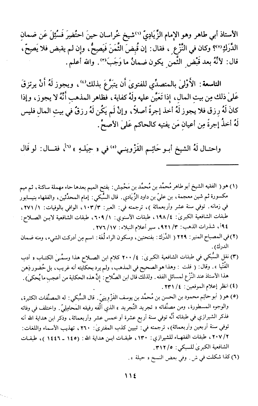 الأستاذ أبي طاهر وهو الإمام الزيادي١ شيخ خراسان حين احتضر فسئل عن ضمان الدرك٢, وكان في النزع، فقال: إن قبض الثمن فيصح، وإن لم يقبض فلا يصح، قال: لأنه بعد قبض الثمن يكون ضمان ما وجب٣. والله أعلم.