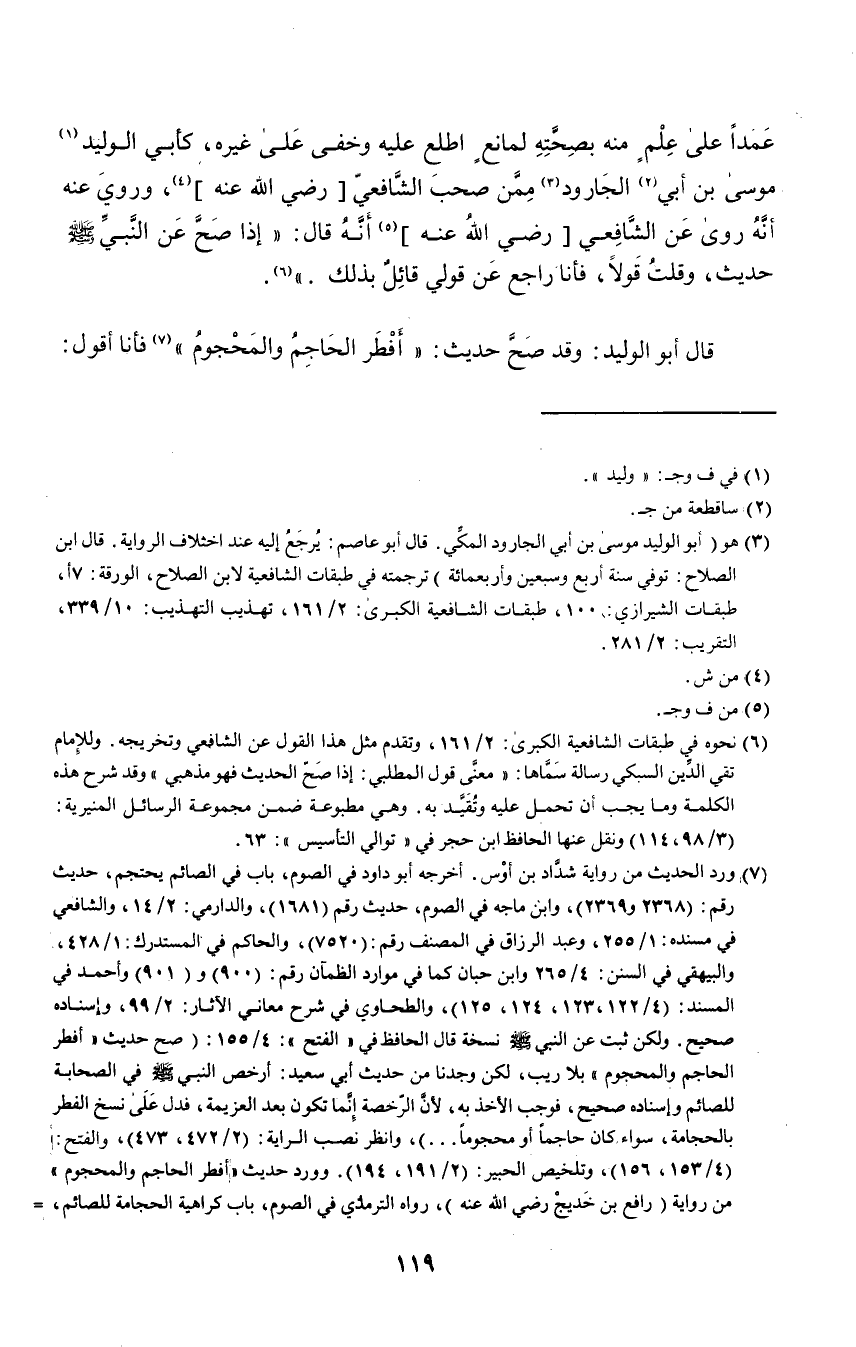 عمدًا على علم منه بصحته لمانع اطلع عليه وخفي على غيره، كأبي الوليد١ موسى بن أبي٢ الجارود٣ ممن صحب الشافعي "رضي الله عنه"٤، وروي عنه أنه روى عن الشافعي "رضي الله عنه"٥ أنه قال: "إذا صح عن النبي صلى الله عليه وسلم حديث، وقلت قولا، فأنا راجع عن قولي قائل بذلك"٦.