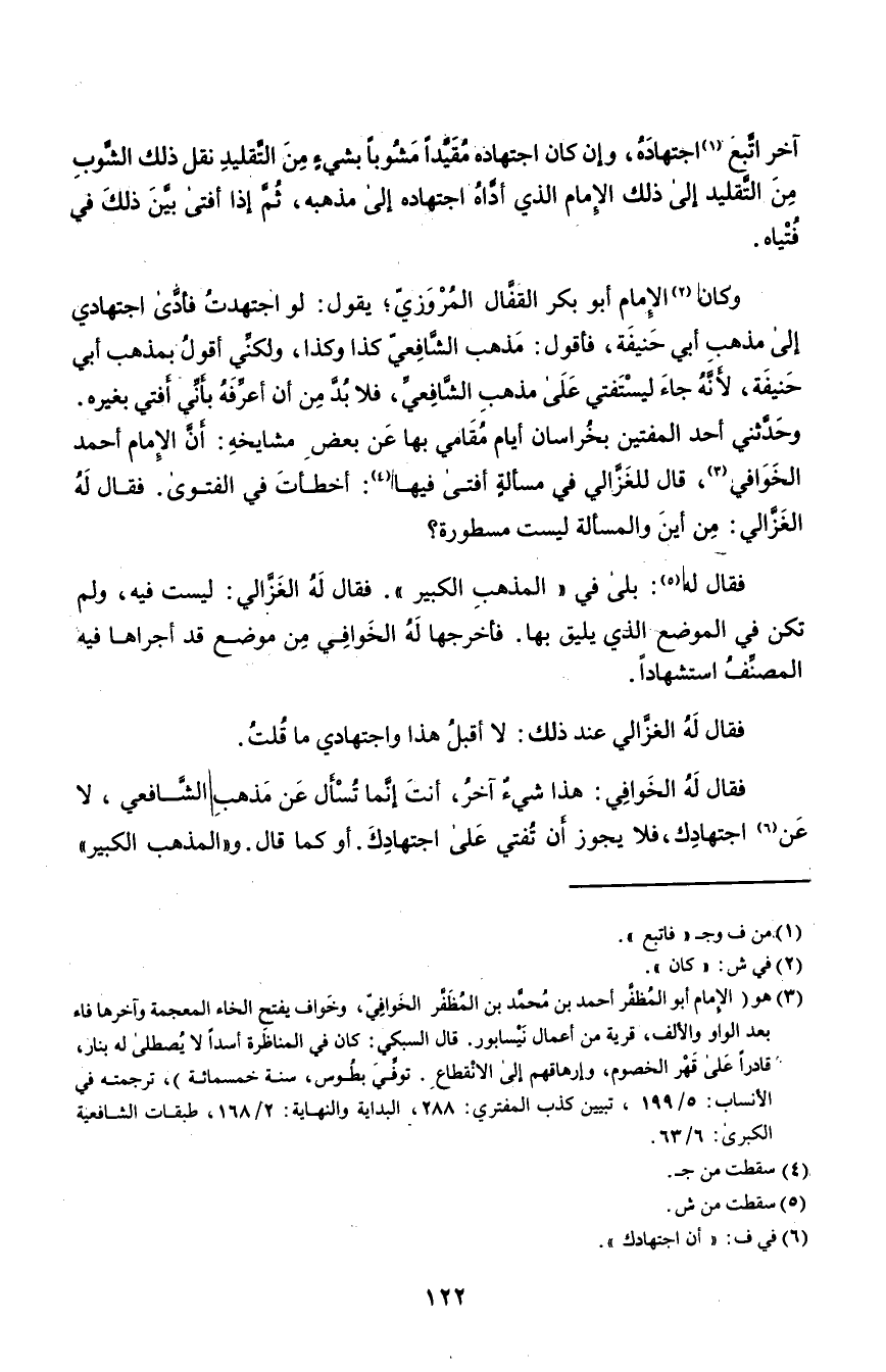 وكان٢ الإمام أبو بكر القفال المروزي؛ يقول: لو اجتهدت فأدى اجتهادي إلى مذهب أبي حنيفة، فأقول: مذهب الشافعي كذا وكذا، ولكني أقول بمذهب أبي حنيفة، لأنه جاء ليستفتي على مذهب الشافعي، فلا بد من أن أعرفه بأني أفتي بغيره. وحدثني أحد المفتين بخراسان أيام مقامي بها عن بعض مشايخه: أن الإمام أحمد الخوافي٣، قال للغزالي في مسألة أفتى فيها٤: أخطأت في الفتوى. فقال له الغزالي: من أين والمسألة ليست مسطورة؟