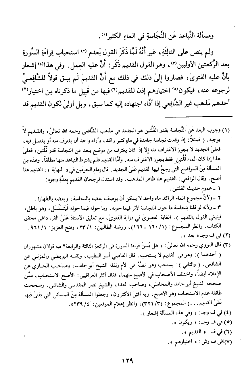 ١ وجوب البعد عن النجاسة بقدر القلتين هو الجديد في مذهب الشافعي رحمه الله تعالى، والقديم لا يوجبه. "فمثلا: إذا وقعت نجاسة جامدة في ماء كثير راكد، وأراد واحد أن يغترف منه أو يغتسل فيه، فعلى الجديد لا يجوز الاغتراف منه إلا إذا كان يغترف من موضع يبعد عن النجاسة قدر قلتين، فعلى هذا إذا كان الماء قلتين فقط يجوز الاغتراف منه. وأما القديم فلم يشترط التباعد منها مطلقًا. وهذه من المسألة من المواضع التي رجح فيها القديم على الجديد. قال إمام الحرمين في "النهاية": القديم هنا أصح. وقال الرافعي: القديم هنا ظاهر المذهب. وقد استدل لرجحان القديم بعدة وجوه: