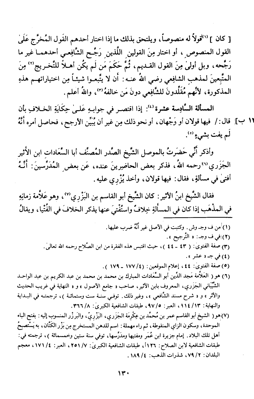 وأذكر أني حضرت بالموصل الشيخ الصدر المصنف أبا السعادات ابن الأثير الجزري٦ رحمه الله، فذكر بعض الحاضرين عنده، عن بعض المدرسين: أنه أفتى في مسألة، فقال: فيها قولان، وأخذ يزري عليه.