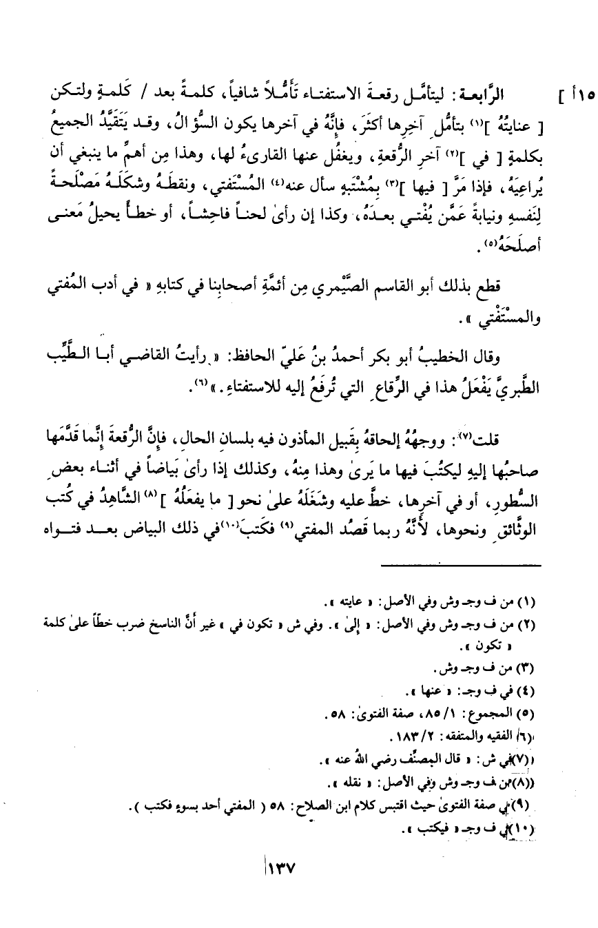 ٩ في صفة الفتوى حيث اقتبس كلام ابن الصلاح: ٥٨ "المفتي أحد بسوء فكتب".