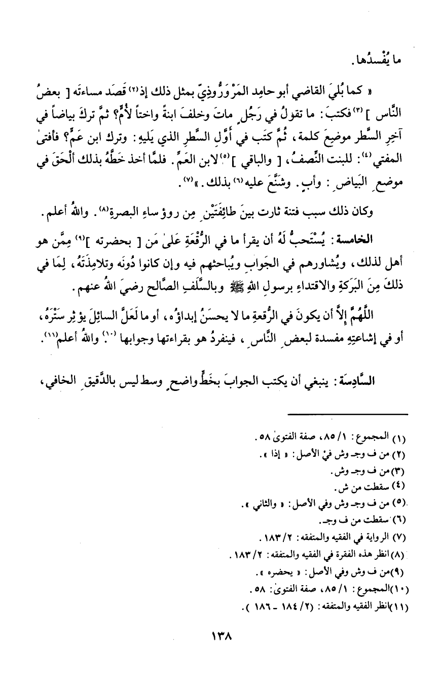 الخامسة: يستحب له أن يقرأ ما في الرقعة على من "بحضرته"٩ ممن هو أهل لذلك، ويشاورهم في الجواب ويباحثهم فيه وإن كانوا دونه وتلامذته، لما في ذلك من البركة والاقتداء برسول الله صلى الله عليه وسلم وبالسلف الصالح رضي الله عنهم.
