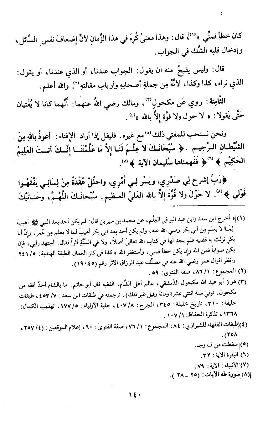 ونحن نستحب للمفتي ذلك٥ مع غيره، فليقل إذا أراد الإفتاء: أعوذ بالله من الشيطان الرجيم, {سُبْحَانَكَ لَا عِلْمَ لَنَا إِلَّا مَا عَلَّمْتَنَا إِنَّكَ أَنْتَ الْعَلِيمُ الْحَكِيمُ} ٦ {فَفَهَّمْنَاهَا سُلَيْمَانَ} الآية٧.