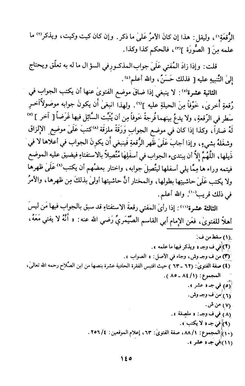 الثانية عشرة٥: لا ينبغي إذا ضاق موضع الفتوى عنها أن يكتب الجواب في رقعة أخرى، خوفًا من الحيلة عليه"٦. ولهذا انبغى أن يكون جوابه موصولا آخر سطر في الرقعة، ولا يدع بينهما فرجة خوفًا من أن يثبت السائل فيها غرضًا "آخر"٧ له ضارًّا، وكذا إذا كان في موضع الجواب ورقة ملزقة٨ كتب على موضع الإلزاق وشغله بشيء، وإذا أجاب على ظهر الرقعة فينبغي أن يكون الجواب في أعلاها لا ذيلها، اللهم إلا أن يبتدئ الجواب في أسفلها متصلا بالاستفتاء فيضيق عليه الموضع فيتمه وراء هذا مما يلي أسفلها ليتصل جوابه، واختار بعضهم أن يكتب٩ على ظهرها ولا يكتب على حاشيتها بطولها، والمختار أن حاشيتها أولى بذلك من ظهرها، والأمر في ذلك قريب١٠. والله أعلم.