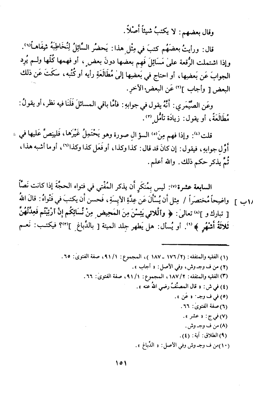 السابعة عشرة٧: ليس بمنكر أن يذكر المفتي في فتواه الحجة إذا كانت نصًّا واضحًا مختصرًا مثل أن يسأل عن عدة الآية، فحسن أن يكتب في فتواه: قال الله "تبارك و"٨ تعالى: {وَاللاَّئِي يَئِسْنَ مِنَ الْمَحِيضِ مِنْ نِسَائِكُمْ إِنِ ارْتَبْتُمْ فَعِدَّتُهُنَّ ثَلاثَةُ أَشْهُرٍ} ٩. أو يسأل: هل يطهر جلد الميتة "بالدباغ"١٠؟ فيكتب: نعم
