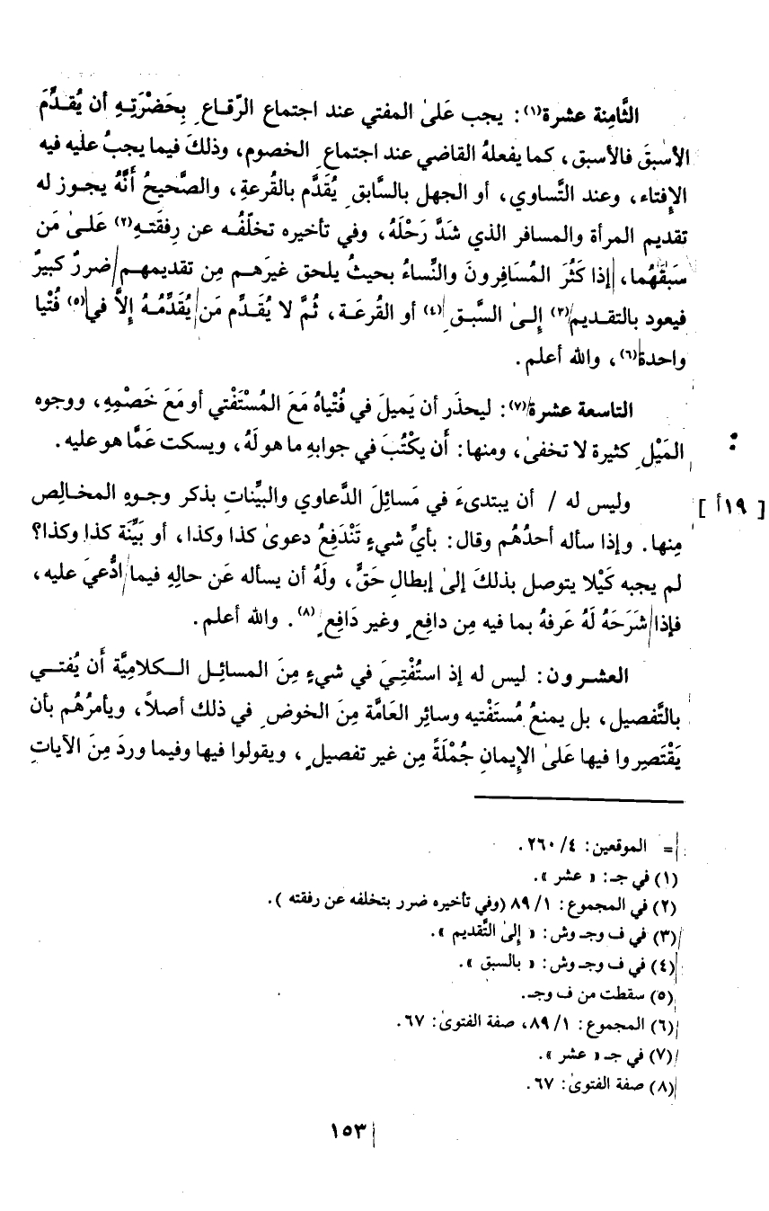 الثامنة عشرة١: يجب على المفتي عند اجتماع الرقاع بحضرته أن يقدم الأسبق فالأسبق، كما يفعله القاضي عند اجتماع الخصوم، وذلك فيما يجب عليه فيه الإفتاء، وعند التساوي، أو الجهل بالسابق يقدم بالقرعة، والصحيح أنه يجوز له تقديم المرأة والمسافر الذي شد رحله، وفي تأخيره تخلفه عن رفقته٢ على من سبقهما، إذا كثر المسافرون والنساء بحيث يلحق غيرهم من تقديمهم ضرر كبير فيعود بالتقديم٣ إلى السبق٤ أو القرعة، ثم لا يقدم من يقدمه إلا في٥ فتيا واحدة٦، والله أعلم.