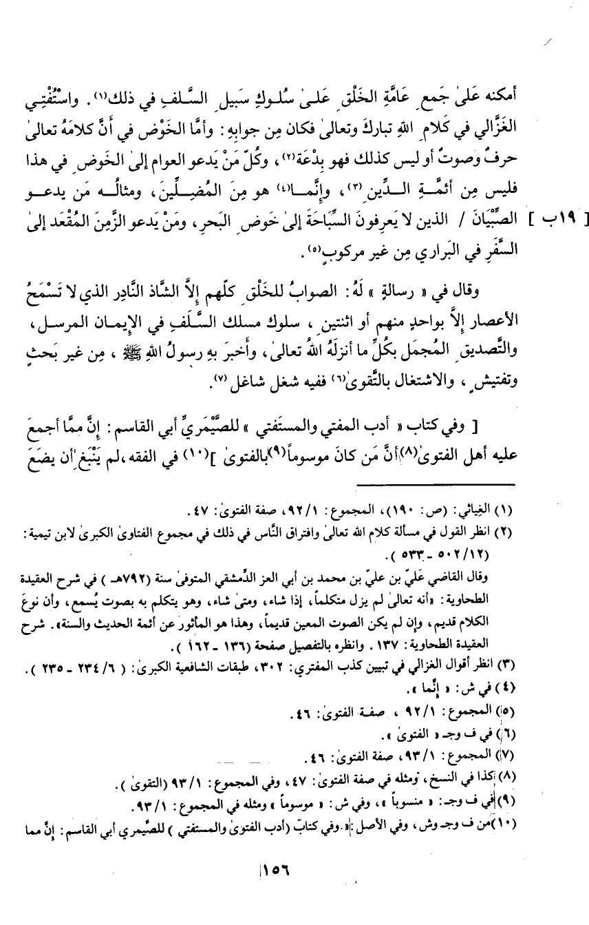 "وفي كتاب "أدب المفتي والمستفتي" للصيمري أبي القاسم: إن مما أجمع عليه أهل الفتوى٨ أن من كان موسومًا٩ بالفتوى"١٠ في الفقه، لم ينبغ أن يضع
