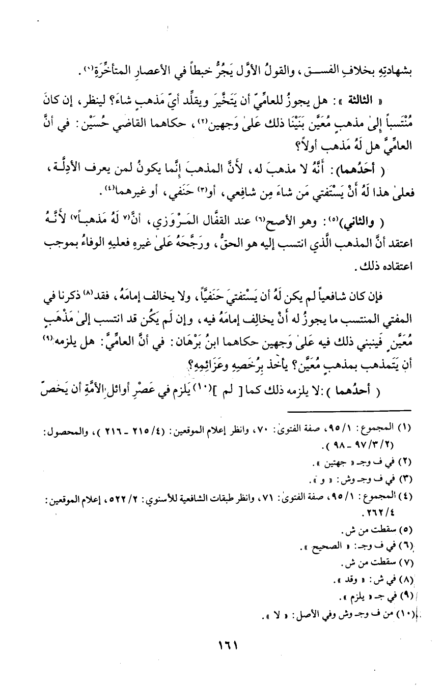 "الثالثة": هل يجوز للعامي أن يتخير ويقلد أي مذهب شاء؟ لينظر، إن كان منتسبًا إلى مذهب معين بنينا ذلك على وجهين٢، حكاهما القاضي حسين: في أن العامي هل له مذهب أولا؟
