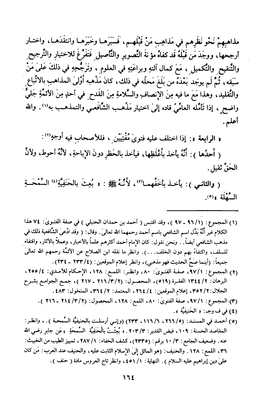 ١ المجموع: "١/ ٩٦-٩٧"، وقد اقتبس "أحمد بن حمدان الحنبلي" في صفة الفتوى: ٧٤ هذا الكلام غير أنه بدل اسم الشافعي باسم أحمد رحمهما الله تعالى. وقال: "وقد ادعى الشافعية ذلك في مذهب الشافعي أيضًا ... ونحن نقول: كان الإمام أحمد أكثرهم علمًا بالأخبار، وعملًا بالآثار، واقتفاء للسلف، واكتفاء بهم دون الخلف ... ". وانظر ما نقله ابن الصلاح عن الأئمة رحمهم الله تعالى جميعًا: "أينما صح الحديث فهو مذهبي"، وانظر إعلام الموقعين: "٤/ ٢٣٣-٢٣٤".