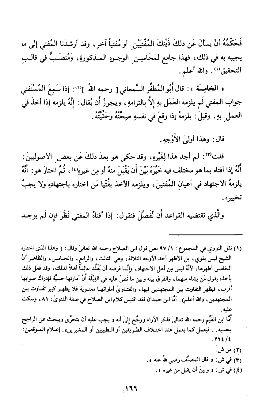 ١ نقل النووي في المجموع: ١/ ٩٧ نص قول ابن الصلاح رحمه الله تعالى وقال: "وهذا الذي اختاره، الشيخ ليس بقوي، بل الأظهر أحد الأوجه الثلاثة، وهي الثالث، والرابع، والخامس، والظاهر أن الخامس أظهرها، لأنه ليس من أهل الاجتهاد، وإنما فرضه أن يقلد عالمًا أهلا لذلك، وقد فعل ذلك بأخذه بقول من يشاء منهما، والفرق بينه وبين ما نص عليه في القبلة أن أمارتها حسية فإدراك صوابها أقرب، فيظهر التفاوت بين المجتهدين فيها، والفتاوى أماراتها معنوية فلا يظهر كبير تفاوت بين المجتهدين، والله أعلم". أما ابن حمدان فقد اقتبس كلام ابن الصلاح في صفة الفتوى: ٨١، وسكت عليه.