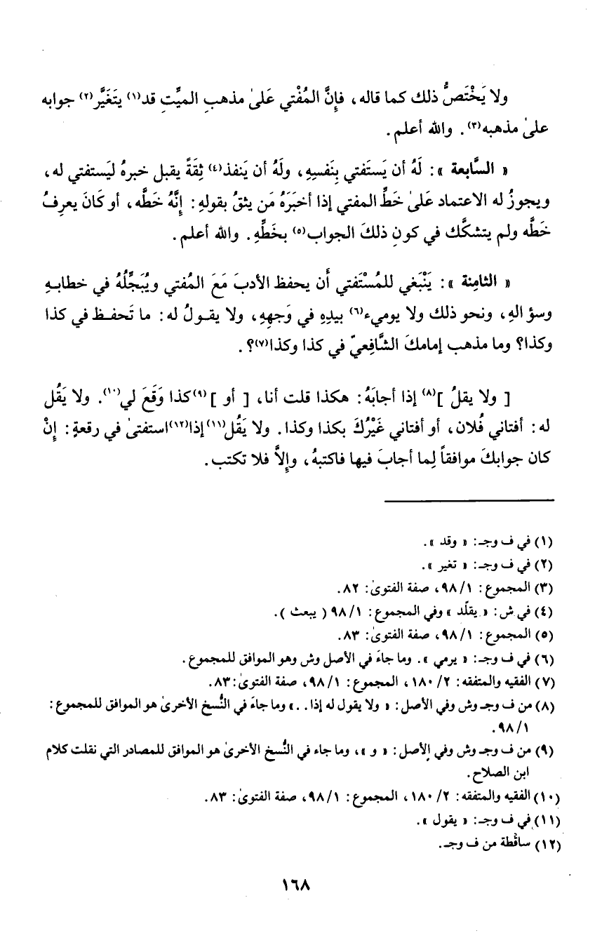 ٧ الفقيه والمتفقه: ٢/ ١٨٠، المجموع: ١/ ٩٨، صفة الفتوى: ٨٣.