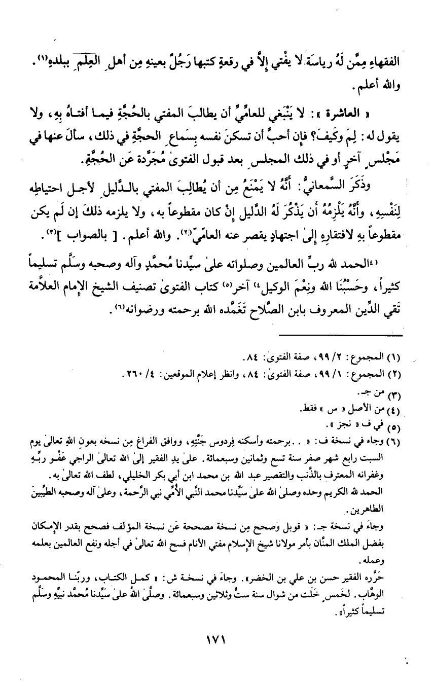 "الحمد لله رب العالمين وصلواته على سيدنا محمد وآله وصحبه وسلم تسليمًا كثيرًا، وحسبنا الله ونعم الوكيل"٤ آخر٥ كتاب الفتوى تصنيف الشيخ الإمام العلامة تقي الدين المعروف بابن الصلاح تغمده الله برحمته ورضوانه٦.
