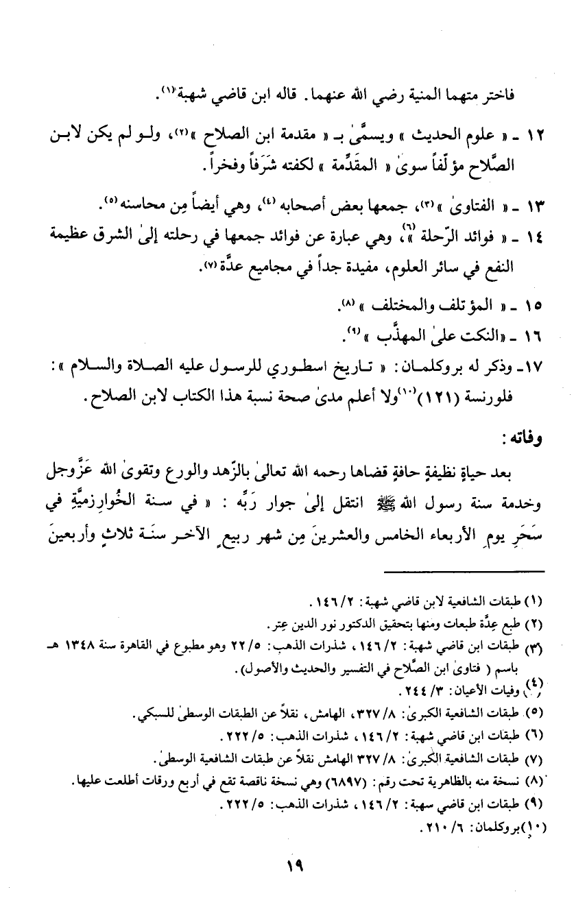 ١٧- وذكر له بروكلمان: "تاريخ أسطوري للرسول عليه الصلاة والسلام": فلورنسة "١٢١"١٠, ولا أعلم مدى صحة نسبة هذا الكتاب لابن الصلاح.