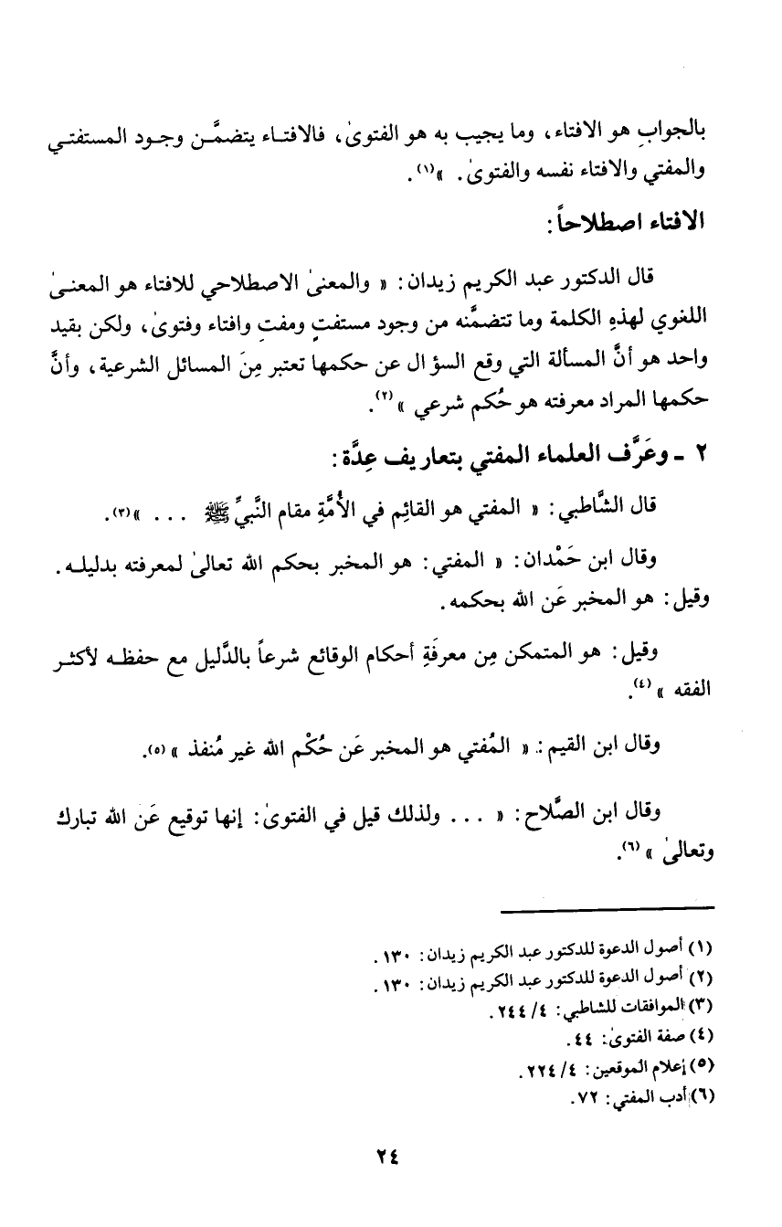قال الدكتور عبد الكريم زيدان: "والمعنى الاصطلاحي للإفتاء هو المعنى اللغوي لهذه الكلمة وما تتضمنه من وجود مستفتٍ ومفتٍ وإفتاء وفتوى، ولكن بقيد واحد هو أن المسألة التي وقع السؤال عن حكمها تعتبر من المسائل الشرعية، وأن حكمها المراد معرفته هو حكم شرعي٢.