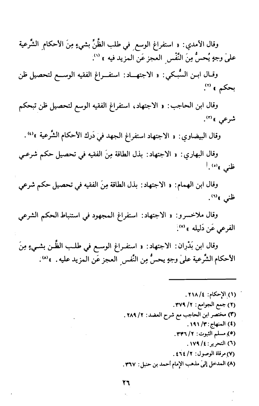 وقال ابن بدران: "الاجتهاد: استفراغ الوسع في طلب الظن بشيء من الأحكام الشرعية على وجه يحس من النفس العجز عن المزيد عليه"٨.