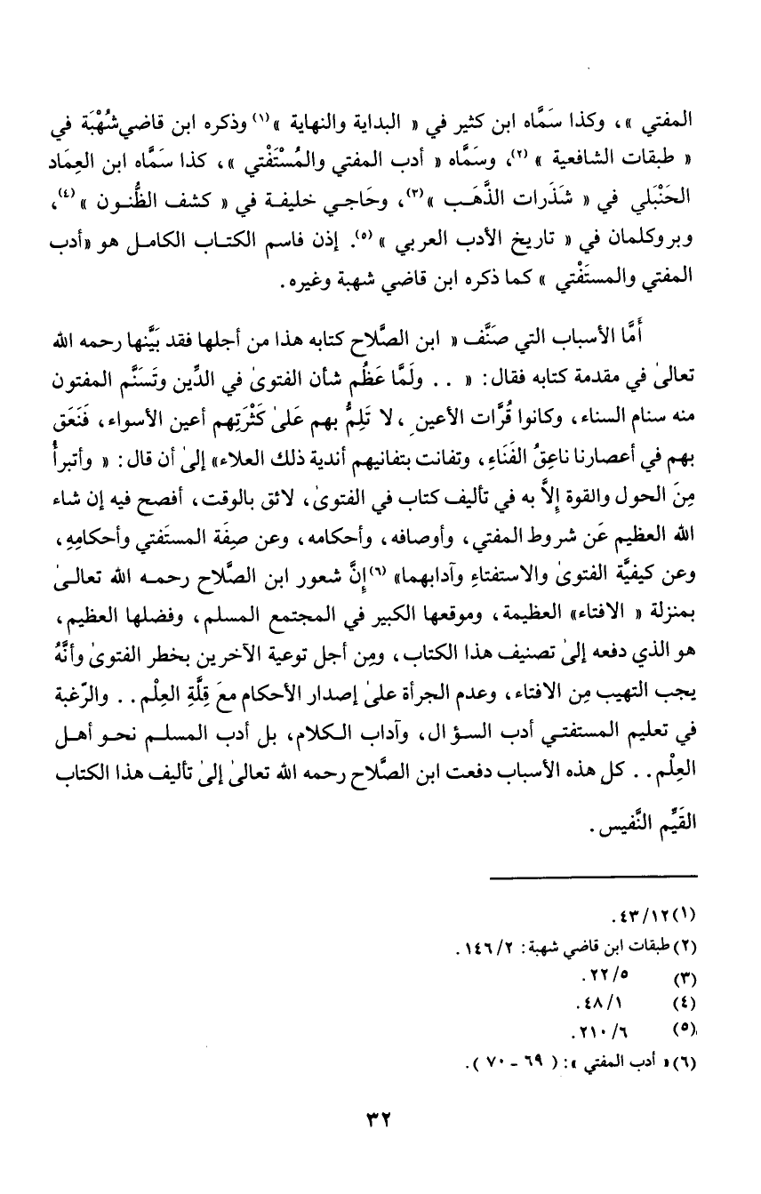 المفتي"، وكذا سماه ابن كثير في "البداية والنهاية"١ وذكره ابن قاضي شهبة في "طبقات الشافعية"٢، وسماه "أدب المفتي والمستفتي"، كذا سماه ابن العماد الحنبلي في "شذرات الذهب"٣، وحاجي خليفة في "كشف الظنون"٤، وبروكلمان في "تاريخ الأدب العربي"٥. إذن فاسم الكتاب الكامل هو "أدب المفتي والمستفتي" كما ذكره ابن قاضي شهبة وغيره.