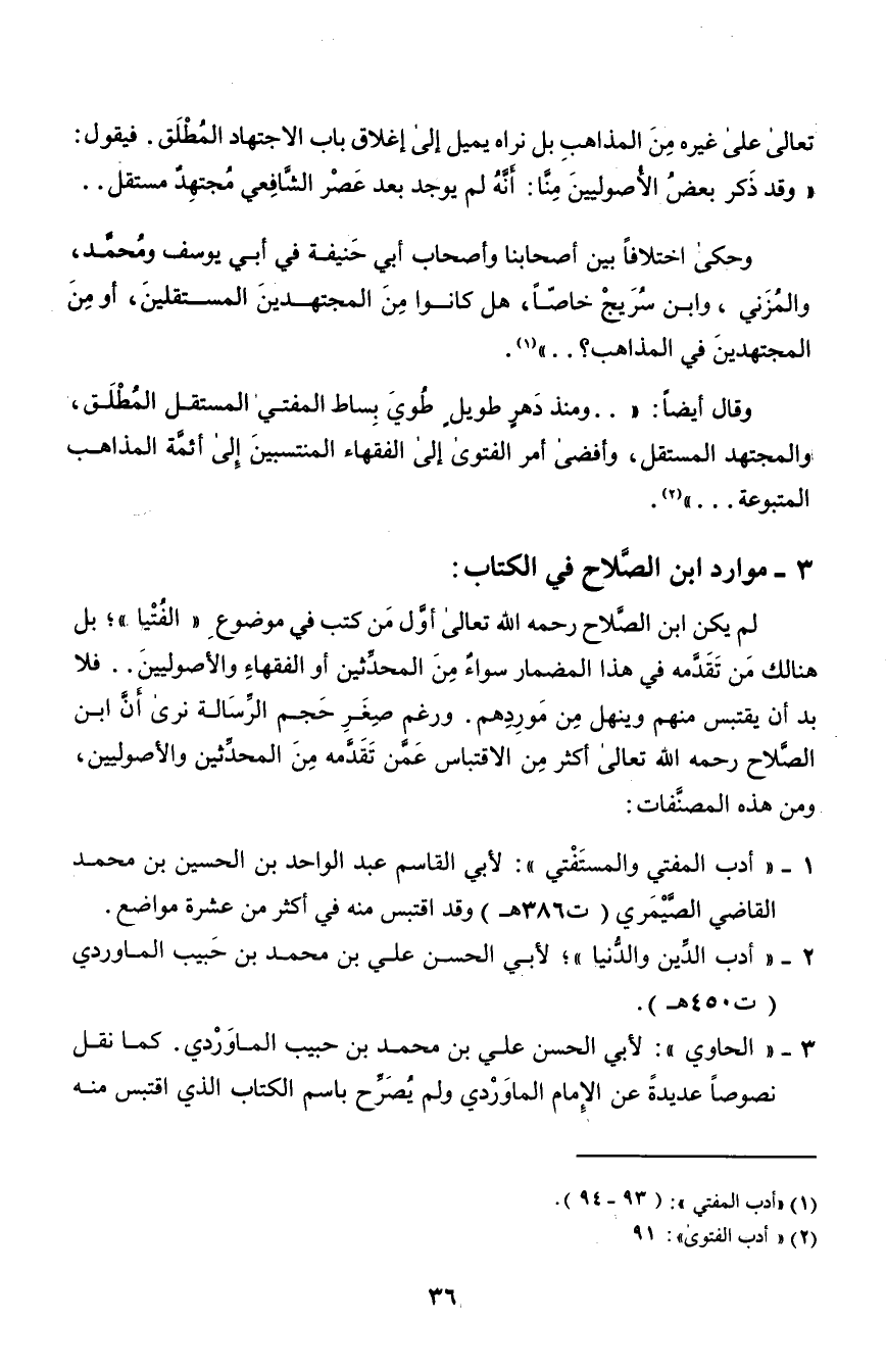 وقال أيضًا: " ... ومنذ دهر طويل طوى بساط المفتي المستقل المطلق، والمجتهد المستقل، وأفضى أمر الفتوى إلى الفقهاء المنتسبين إلى أئمة المذاهب المتبوعة ... "٢.