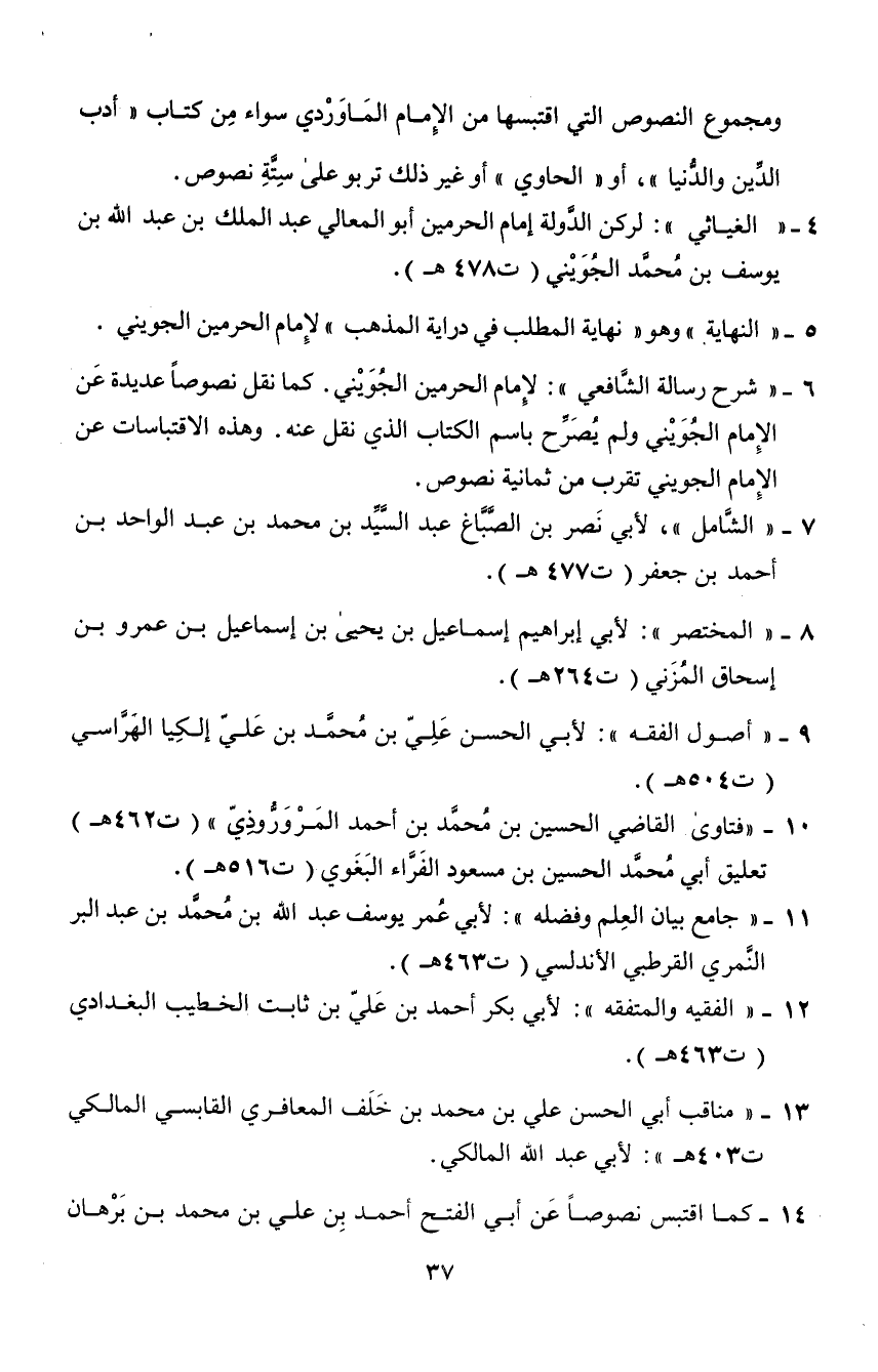 ٦- "شرح رسالة الشافعي": لإمام الحرمين الجويني. كما نقل نصوصًا عديدة عن الإمام الجويني ولم يصرح باسم الكتاب الذي نقل عنه. وهذه الاقتباسات عن الإمام الجويني تقرب من ثمانية نصوص.