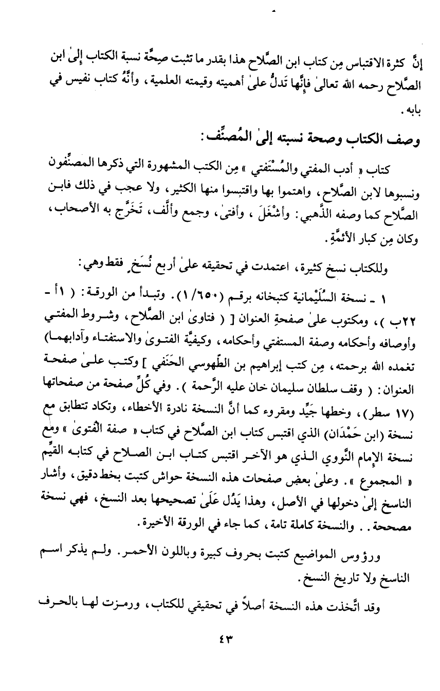 ١- نسخة السليمانية كتبخانه برقم "٦٥٠/ ١". وتبدأ من الورقة: "١أ-٢٢ب"، ومكتوب على صفحة العنوان ""فتاوى ابن الصلاح، وشروط المفتي وأوصافه وأحكامه وصفة المستفتي وأحكامه، وكيفية الفتوى والاستفتاء وآدابهما" تغمده الله برحمته، من كتب إبراهيم بن الطهوسي الحنفي", وكتب على صفحة العنوان: "وقف سلطان سليمان خان عليه الرحمة". وفي كل صفحة من صفحاتها "١٧ سطرًا"، وخطها جيد ومقروء كما أن النسخة نادرة الأخطاء، وتكاد تتطابق مع نسخة "ابن حمدان" الذي اقتبس كتاب ابن الصلاح في كتاب "صفة الفتوى" ومع نسخة الإمام النووي الذي هو الآخر اقتبس كتاب ابن الصلاح في كتابه القيم "المجموع". وعلى بعض صفحات هذه النسخة حواش كتبت بخط دقيق، وأشار الناسخ إلى دخولها في الأصل، وهذا يدل على تصحيحها بعد النسخ، فهي نسخة مصححة ... والنسخة كاملة تامة، كما جاء في الورقة الأخيرة.