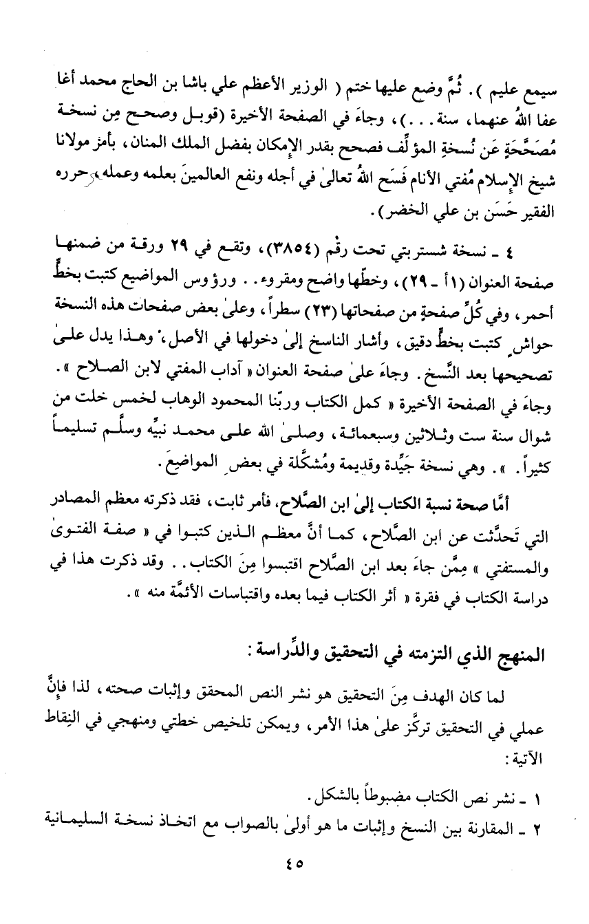 ٤- نسخة شستربتي تحت رقم "٣٨٥٤"، وتقع في ٢٩ ورقة من ضمنها صفحة العنوان "١أ-٢٩"، وخطها واضح ومقروء ... ورؤوس المواضيع كتبت بخط أحمر، وفي كل صفحة من صفحاتها "٢٣" سطرًا، وعلى بعض صفحات هذه النسخة حواش كتبت بخط دقيق، وأشار الناسخ إلى دخولها في الأصل، وهذا يدل على تصحيحها بعد النسخ. وجاء على صفحة العنوان "آداب المفتي لابن الصلاح"، وجاء في الصفحة الأخيرة "كمل الكتاب وربنا المحمود الوهاب لخمس خلت من شوال سنة ست وثلاثين وسبعمائة، وصلى الله على محمد نبيه وسلم تسليمًا كثيرًا". وهي نسخة جيدة وقديمة ومشكلة في بعض المواضع.