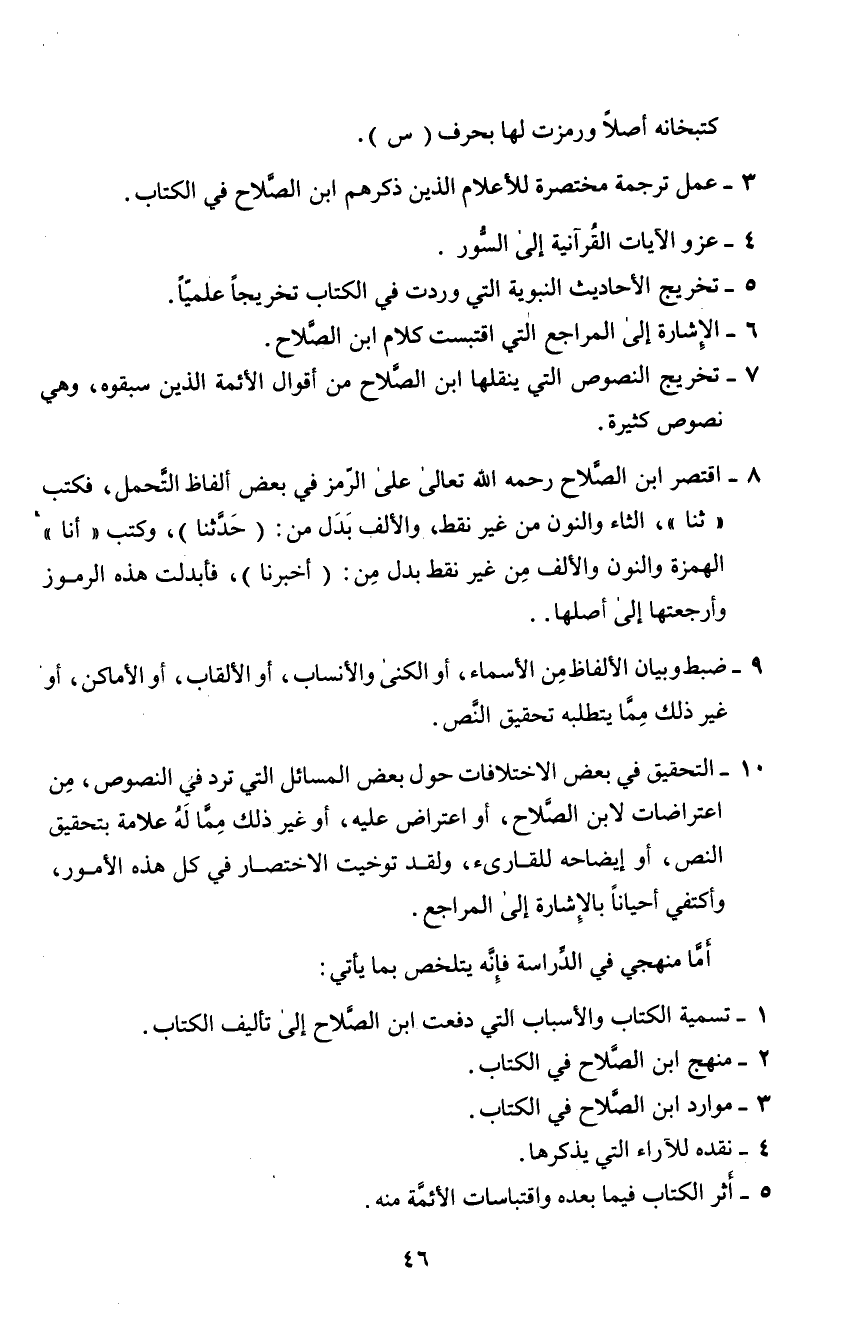 ١٠- التحقيق في بعض الاختلافات حول بعض المسائل التي ترد في النصوص، من اعتراضات لابن الصلاح، أو اعتراض عليه، أو غير ذلك مما له علامة بتحقيق النص، أو إيضاحه للقارئ، ولقد توخيت الاختصار في كل هذه الأمور، وأكتفي أحيانًا بالإشارة إلى المراجع.